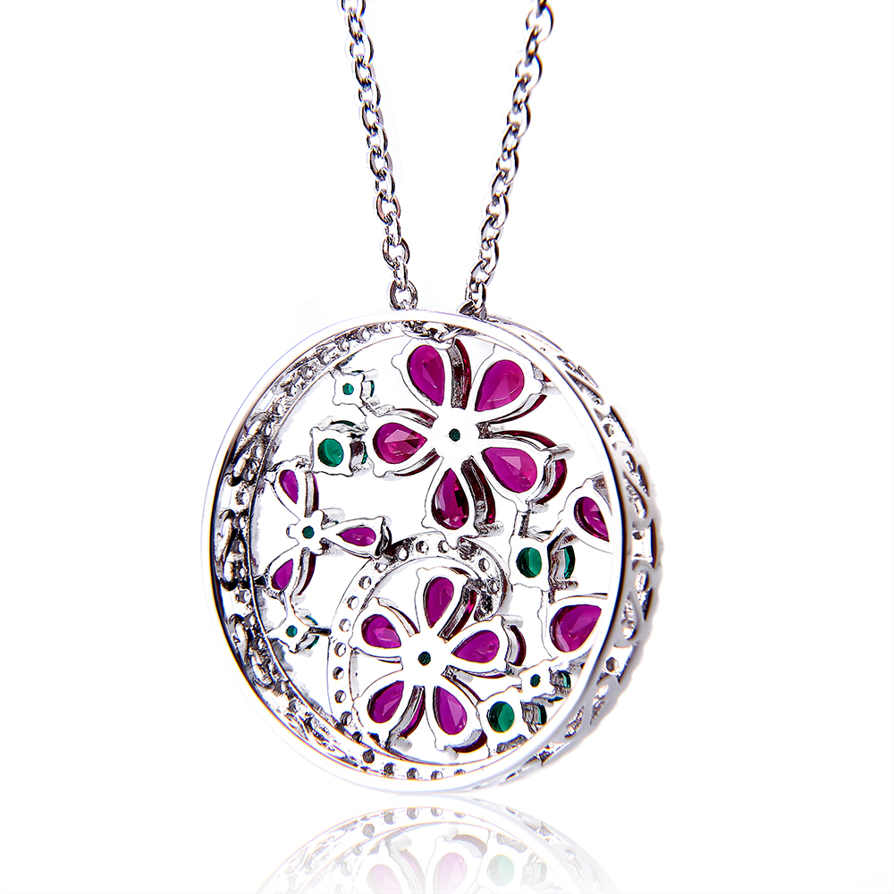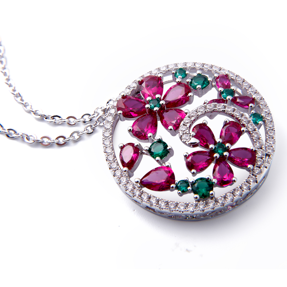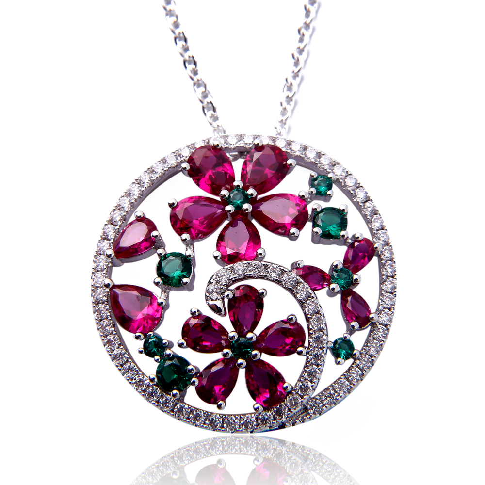 This ruby jewelry pendant design for winter season, match with sweater to showing the female fascination. It is made of alloy copper and setting with ruby, green glass and zircon stone around.