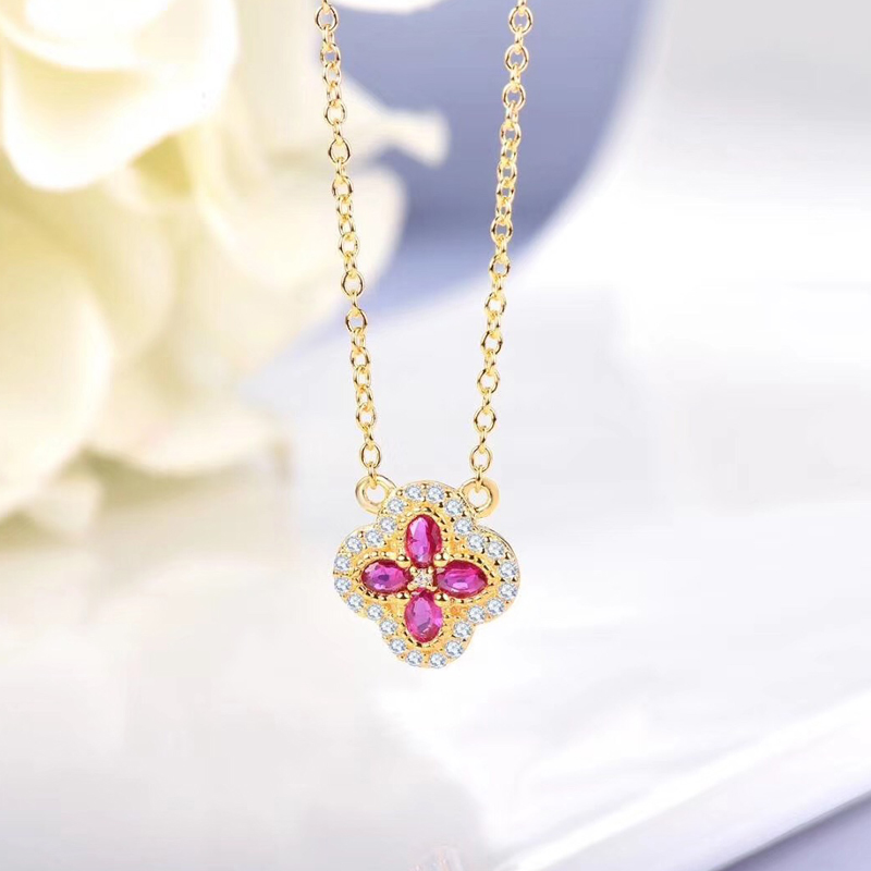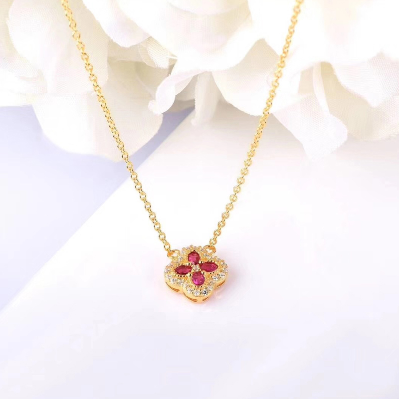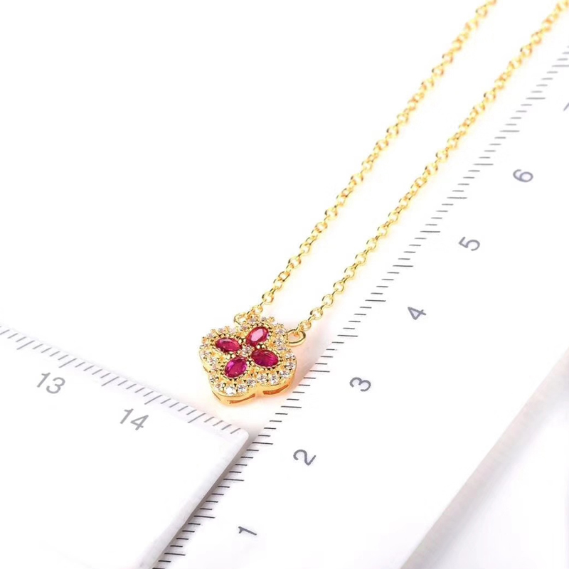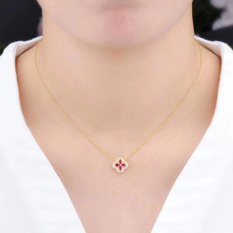 18K Yellow18K Yellow Gold and Diamond Necklace with Ruby Clover for Women