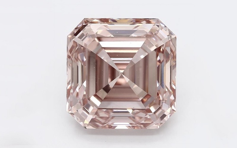 “The Pink Rose” pink diamond was synthesized by Chemical Vapor Deposition (CVD) using Asscher Cut. It is graded Fancy Orangy Pink by GCAL, and its clarity is VS2. level.