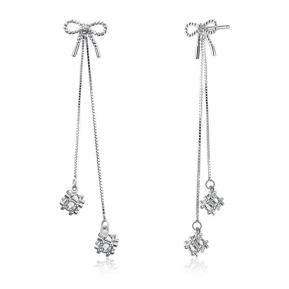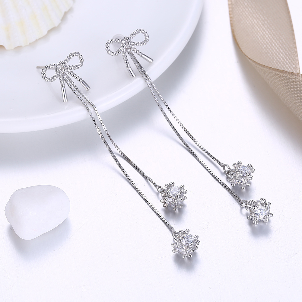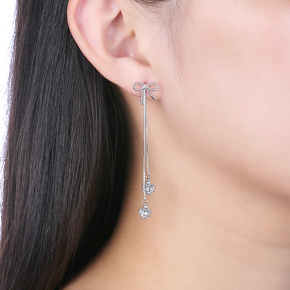 This bow-tie design sterling silver earring is based on 18K white gold plated S925 sterling silver with gorgeous AAA CZ stones. Beautiful combination of bow-tie design and long tassel is hot selling among young people.