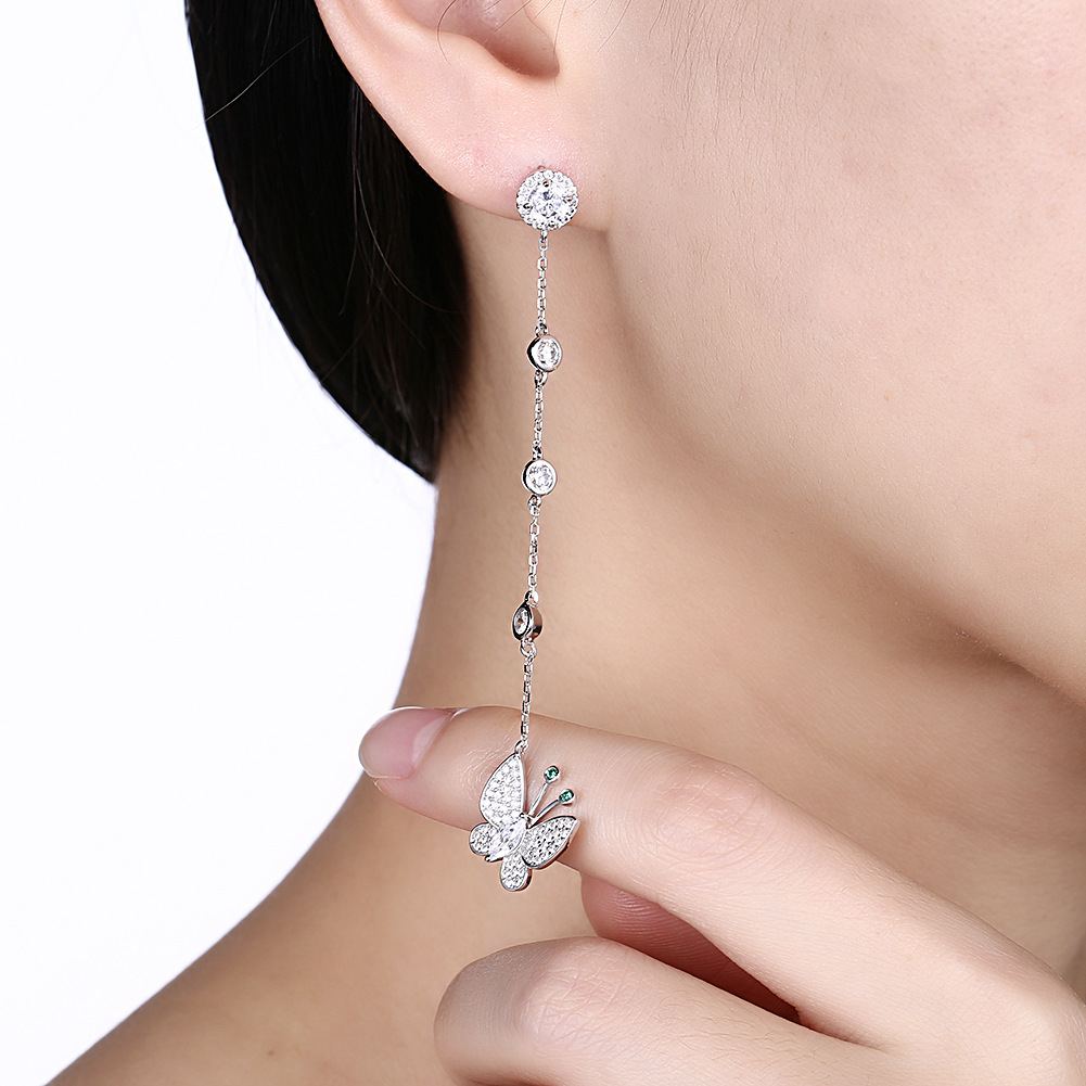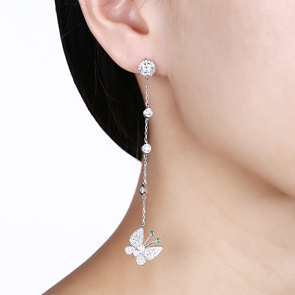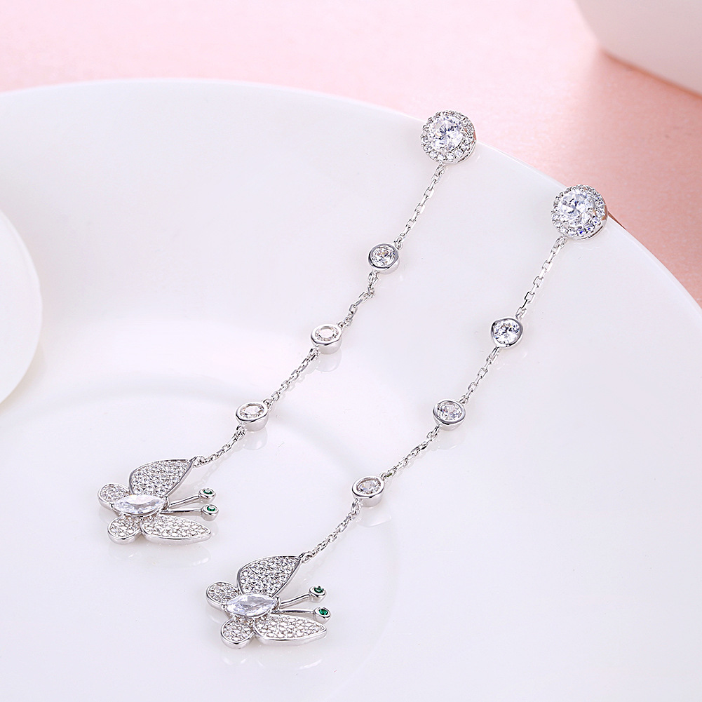 This tassel design pendant earring is based on 18K white gold plated. Main material is S925 sterling silver with AAA CZ stones. Perfect combination of butterfly design and long tassel is popular with young people.