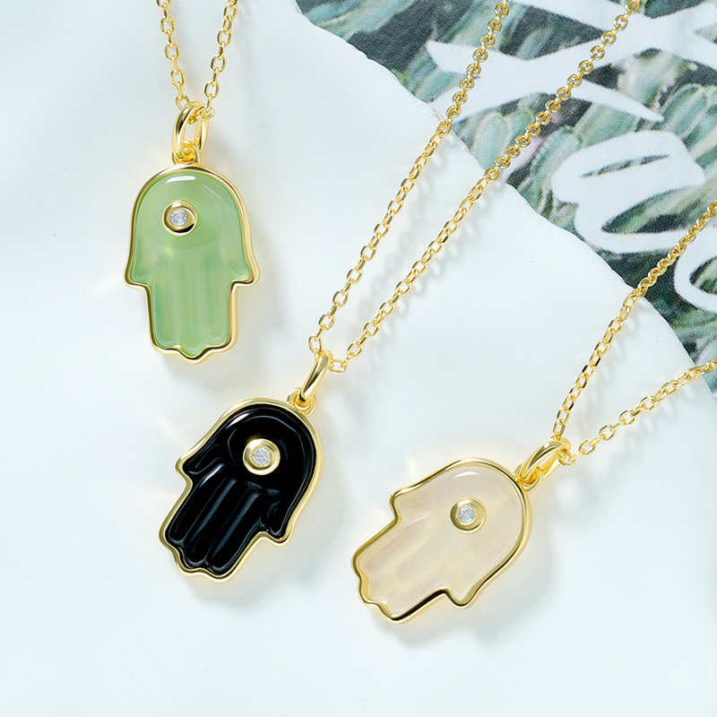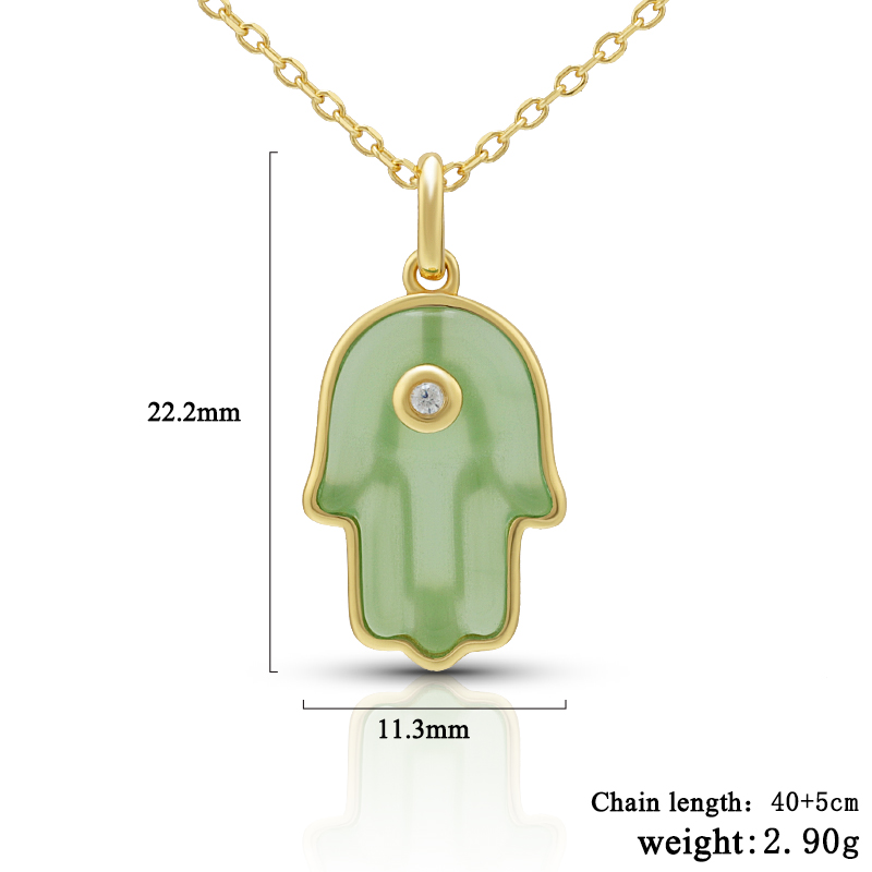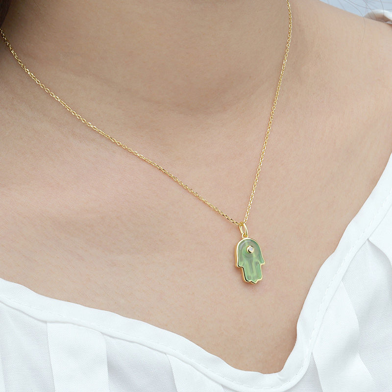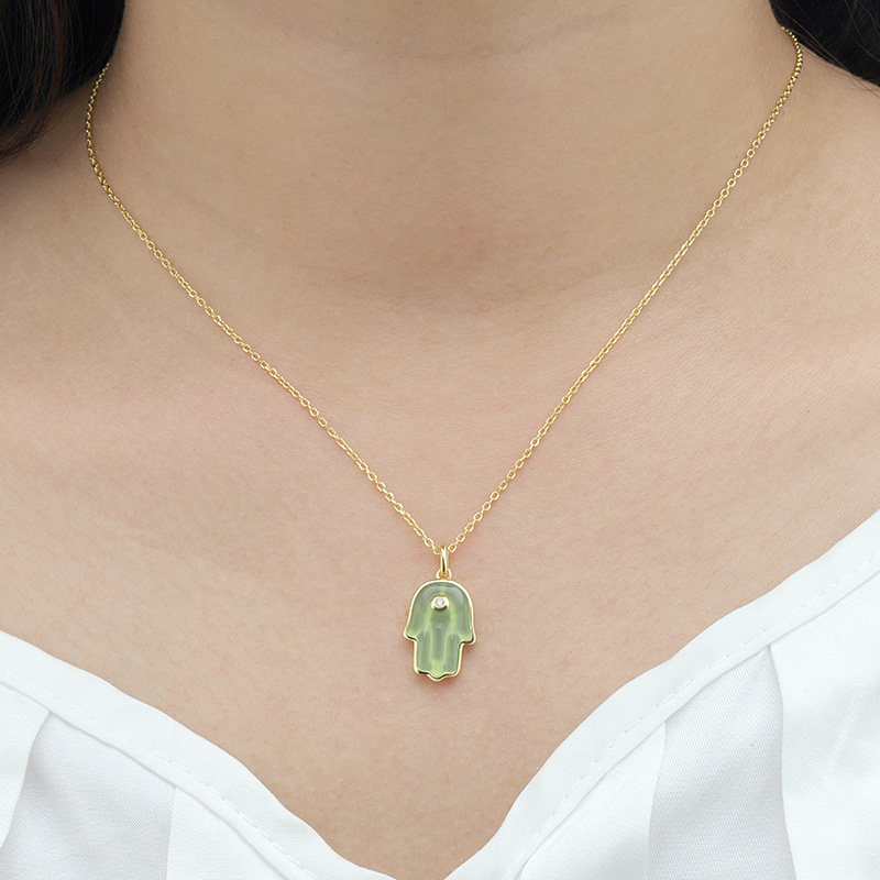 The Chrysoprase Hasma Hand Necklace is crafted in 925 sterling silver gold plated with fine jewelry craft.