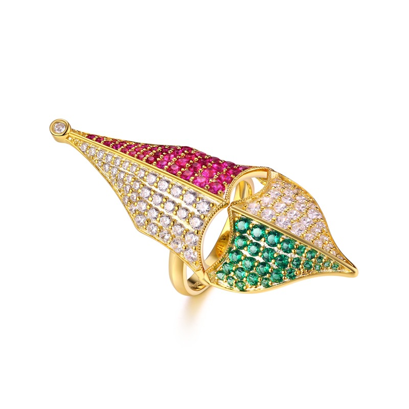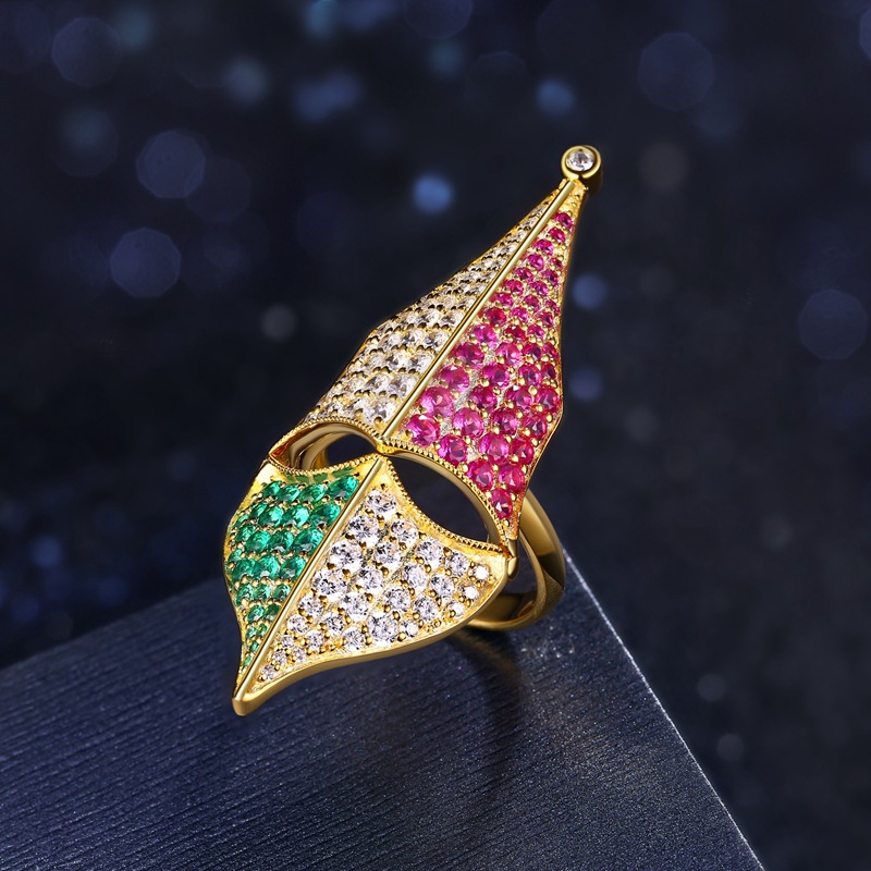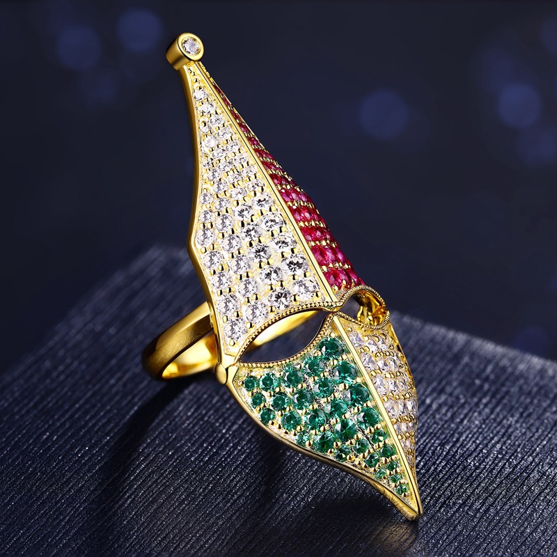 A women's ring jewelry is based on 18K gold plated. Main material is 925 sterling silver. It is setting with different colors of AAA CZ. Combination of mask design and beautiful zircon makes it very unique and shinning.