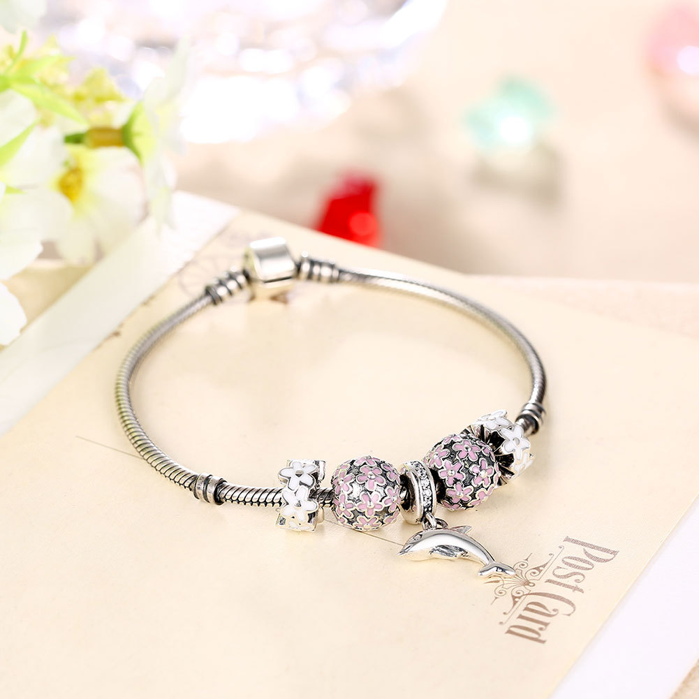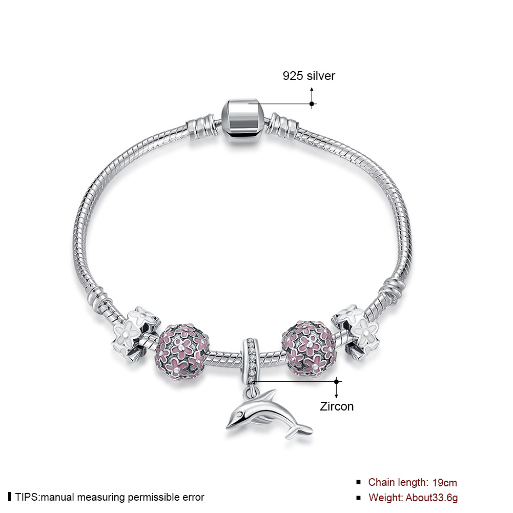 A fashionable 925 silver charm bracelets with silver enameled beads and setting with some AAA CZ zircon stones. Vivid dolphin makes this silver bracelets more lovely and beautiful.