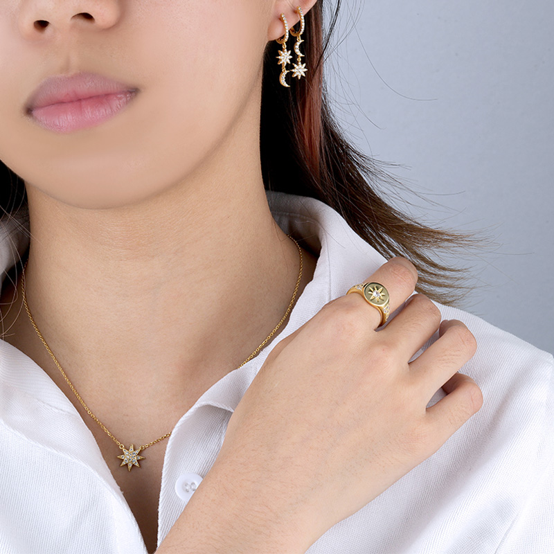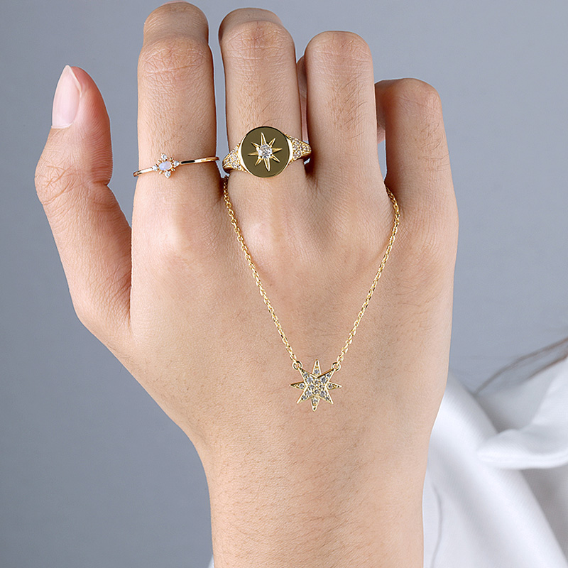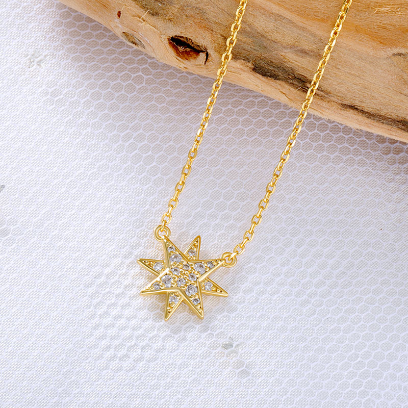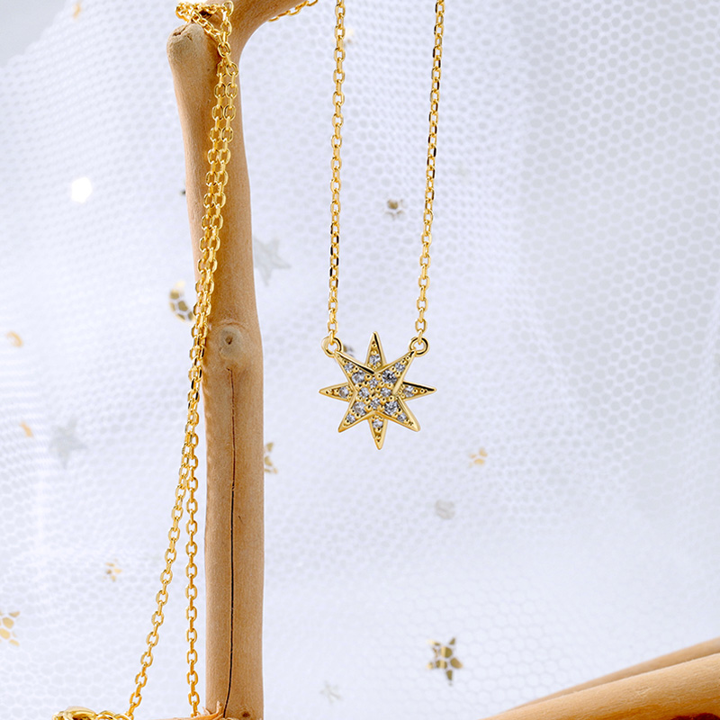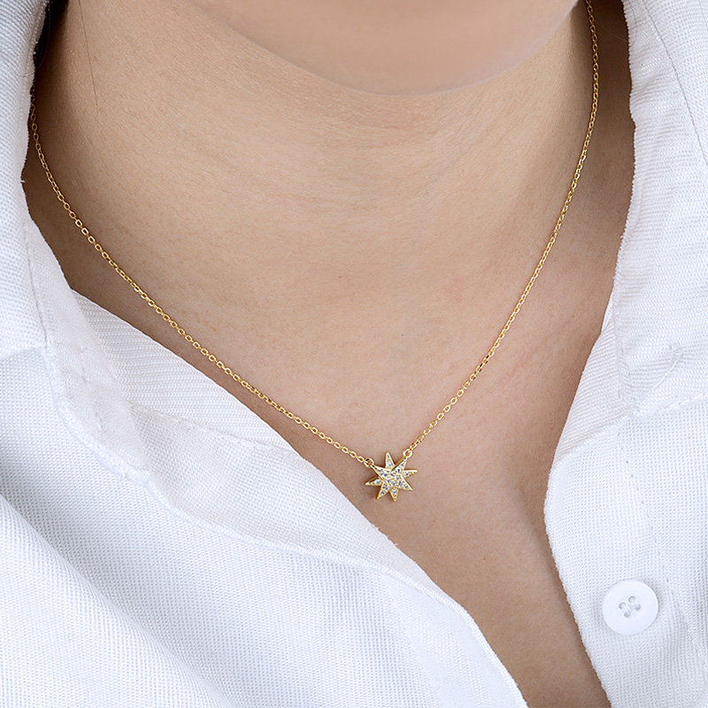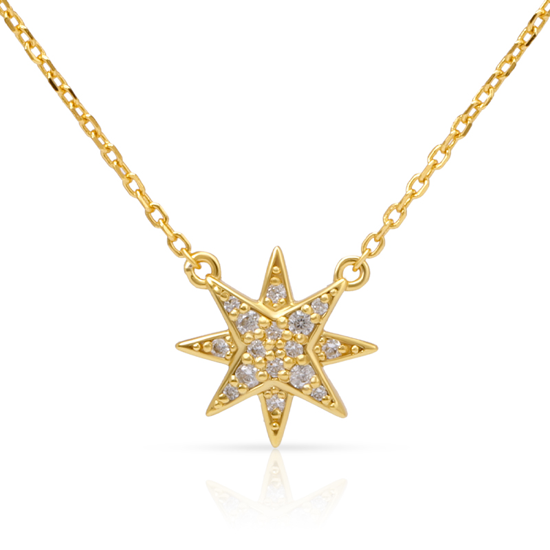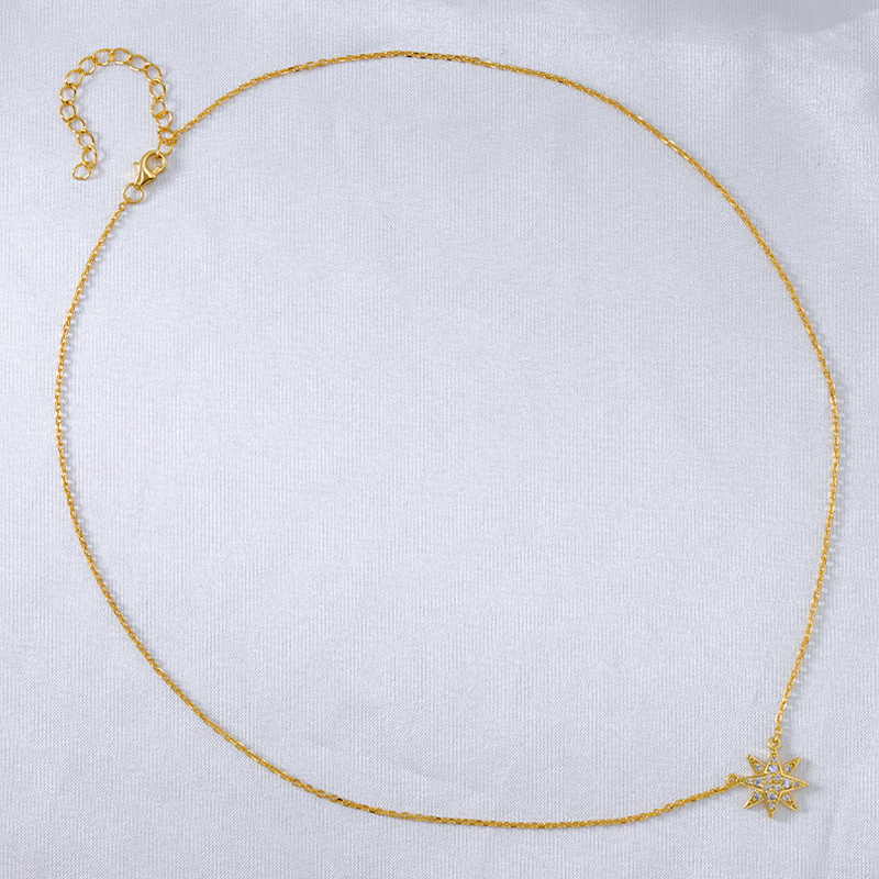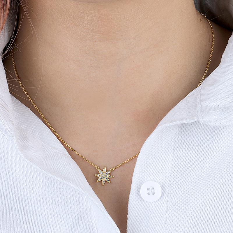 The eight pointed star necklace is crafted in 925 sterling silver real gold plated with fine jewelry craft.