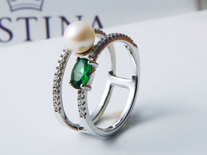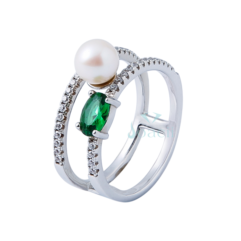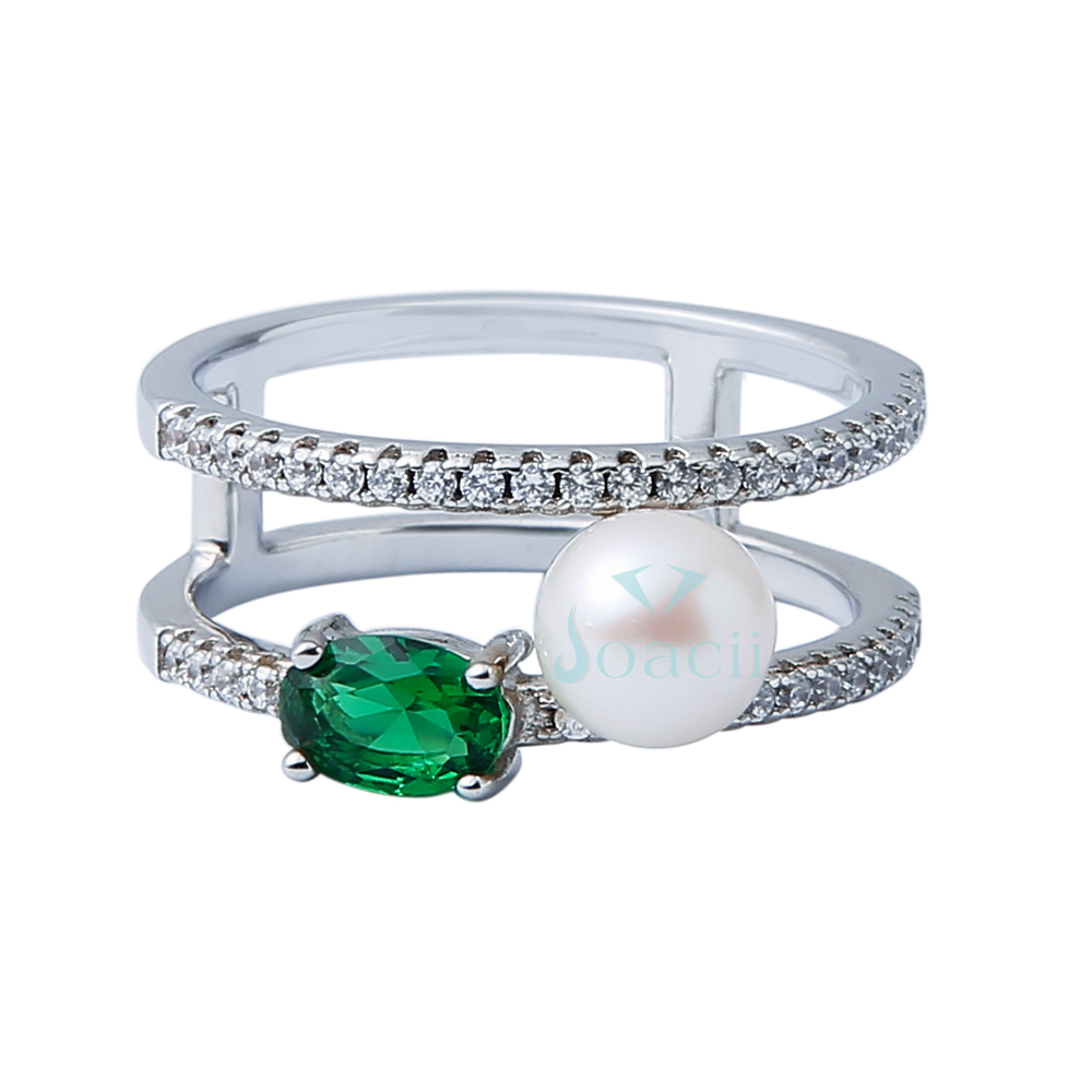 Joacii pearl silver jewelry ring. Oval cutting emerald diamond setting in this sterling silver cluster ring with a beautiful pearl. Some AAA CZ stones pave setting around the emerald and pearl, is a kind of fashion but elegant design ring.