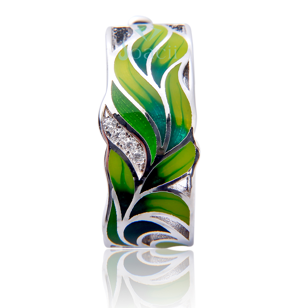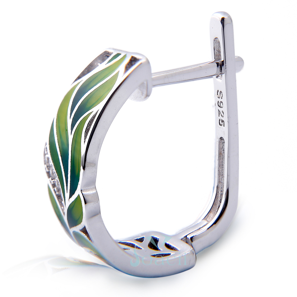 Enamel crafted of 18K silver plated hoop earrings display a beautiful green leaf design. The earrings are setting with top class AAA CZ stone, and it is available to setting with other gemstone like as ruby, sapphire and topaz etc.