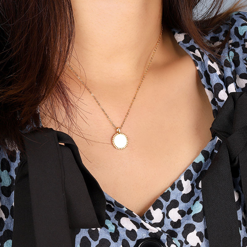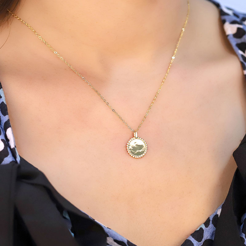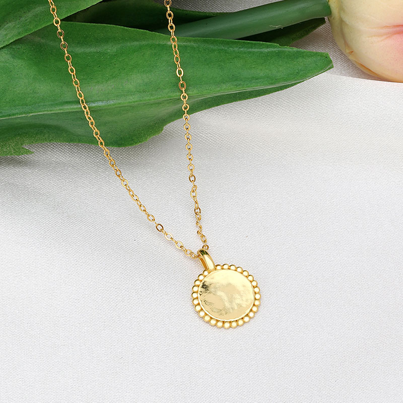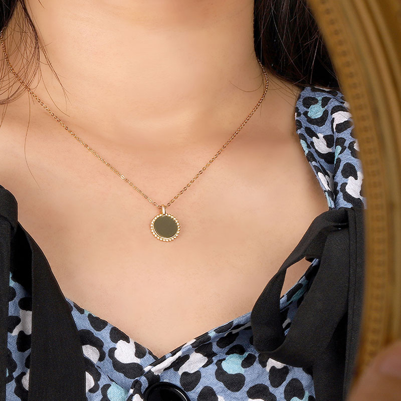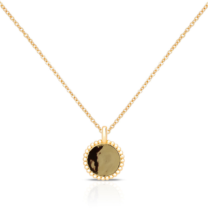The engraved disk necklace is crafted in 925 sterling silver real gold plated with fine jewelry craft. This necklace supports customization.