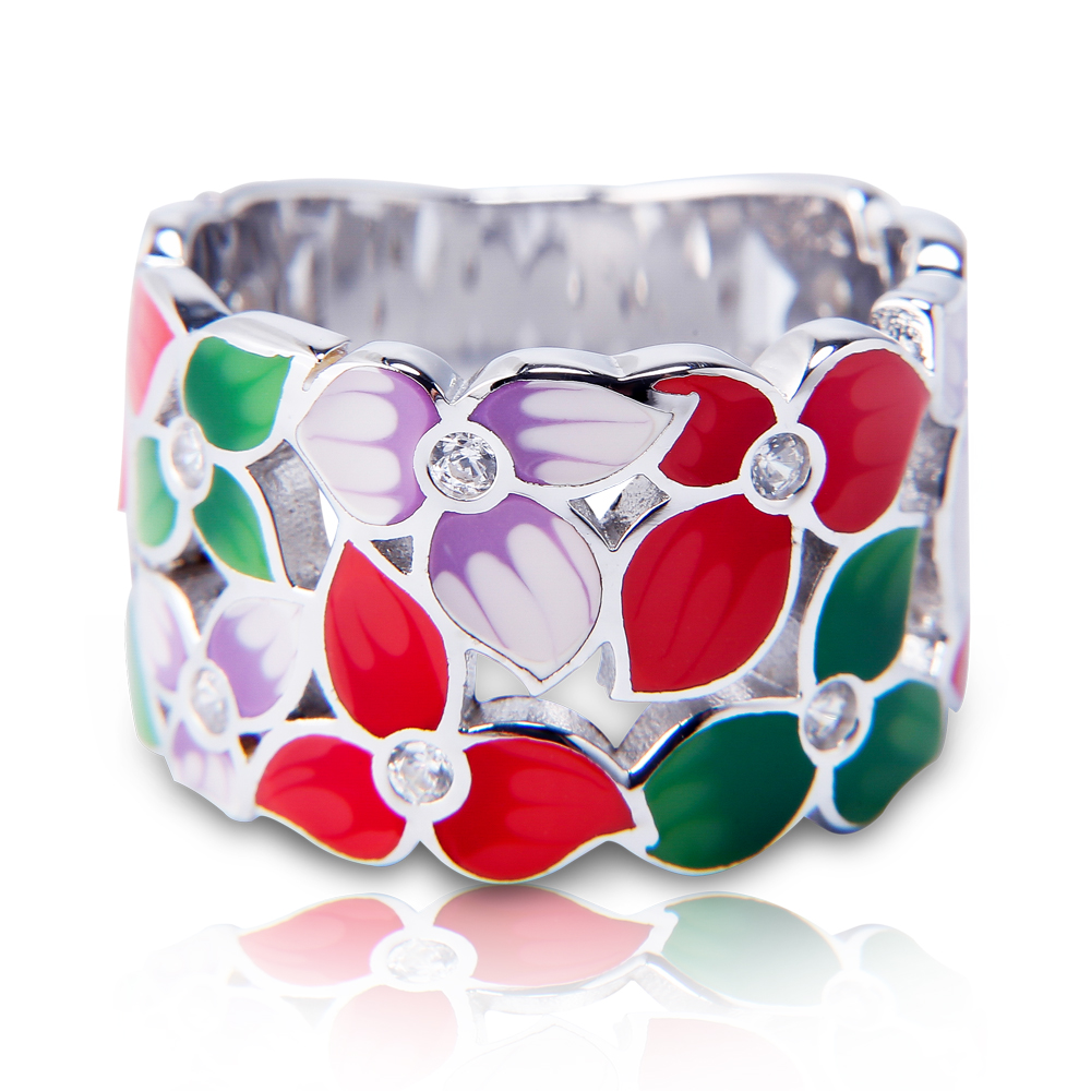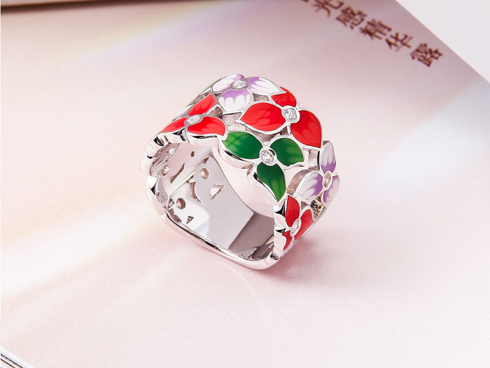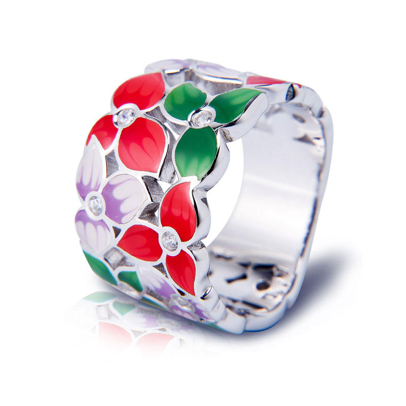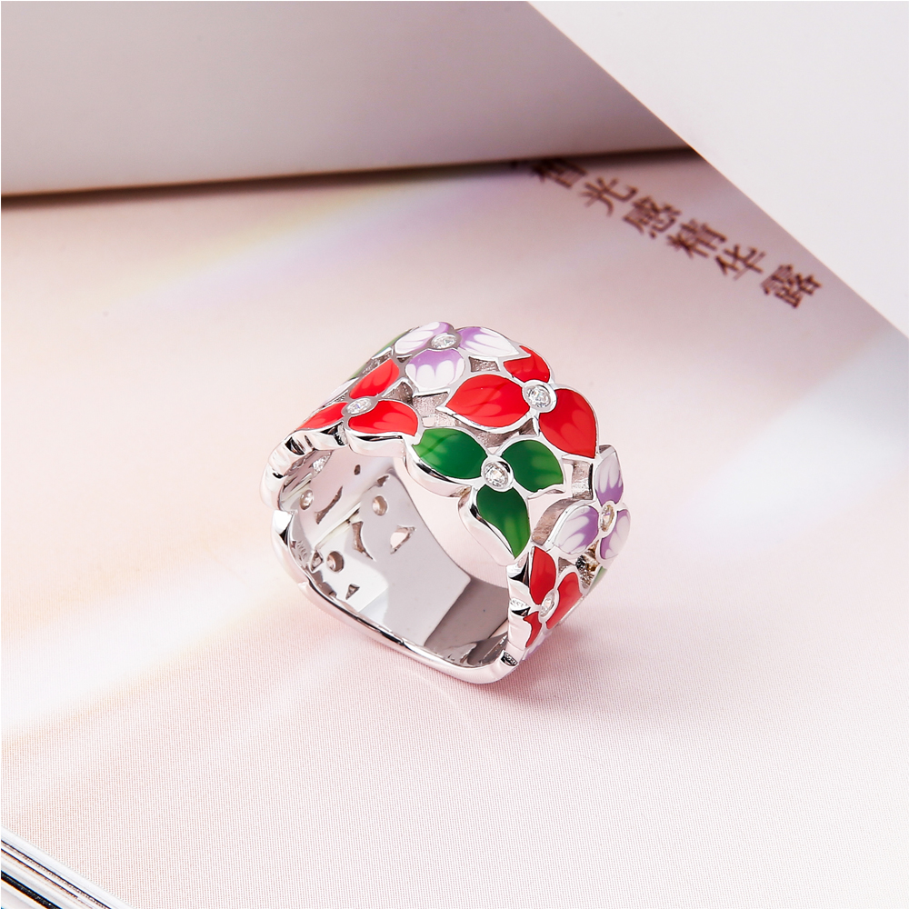Fashion jewelry rings enamel with 3 colors flower. Red, green and lavender colors. The whole rings is composed of flowers. Each flowers connect to be a rings. Also the bright CZ stone in the flower central with bezel setting.