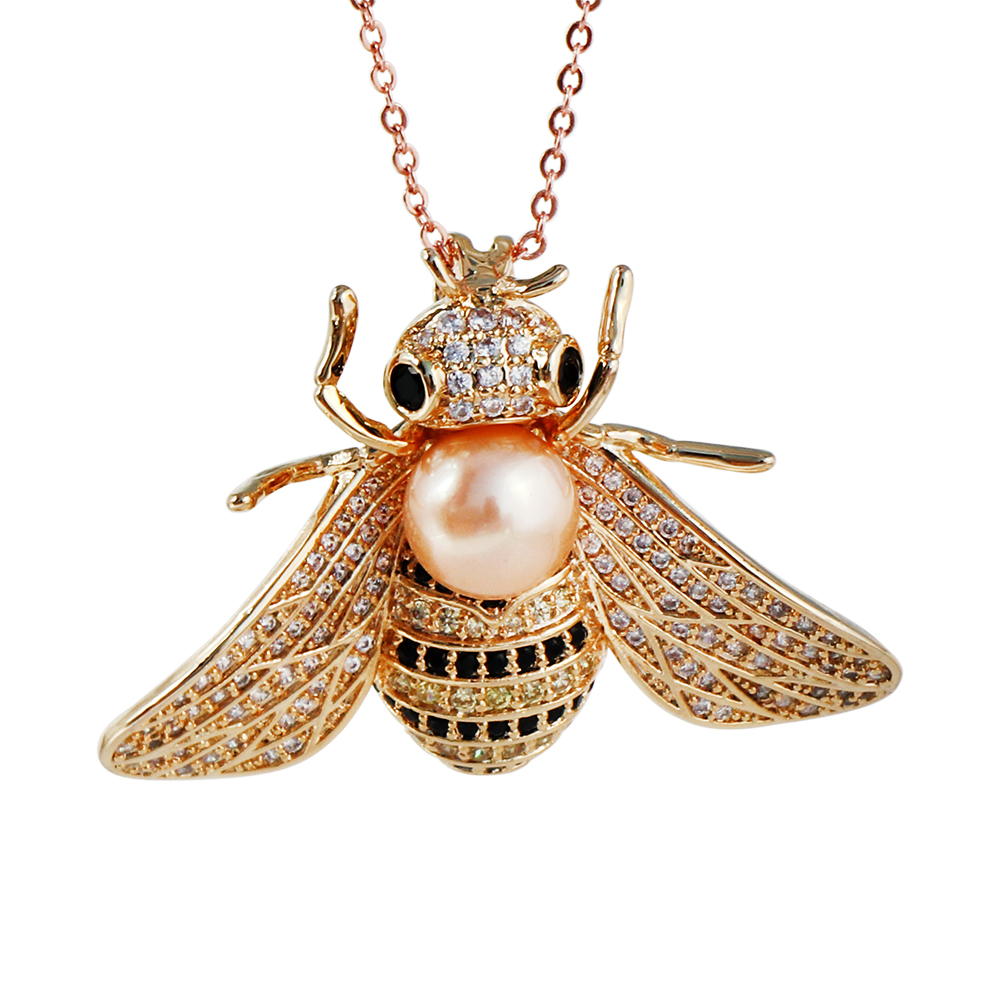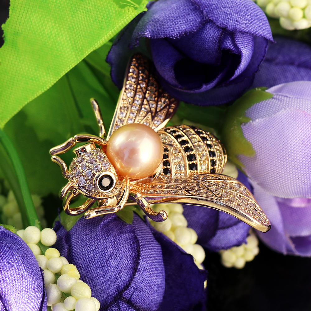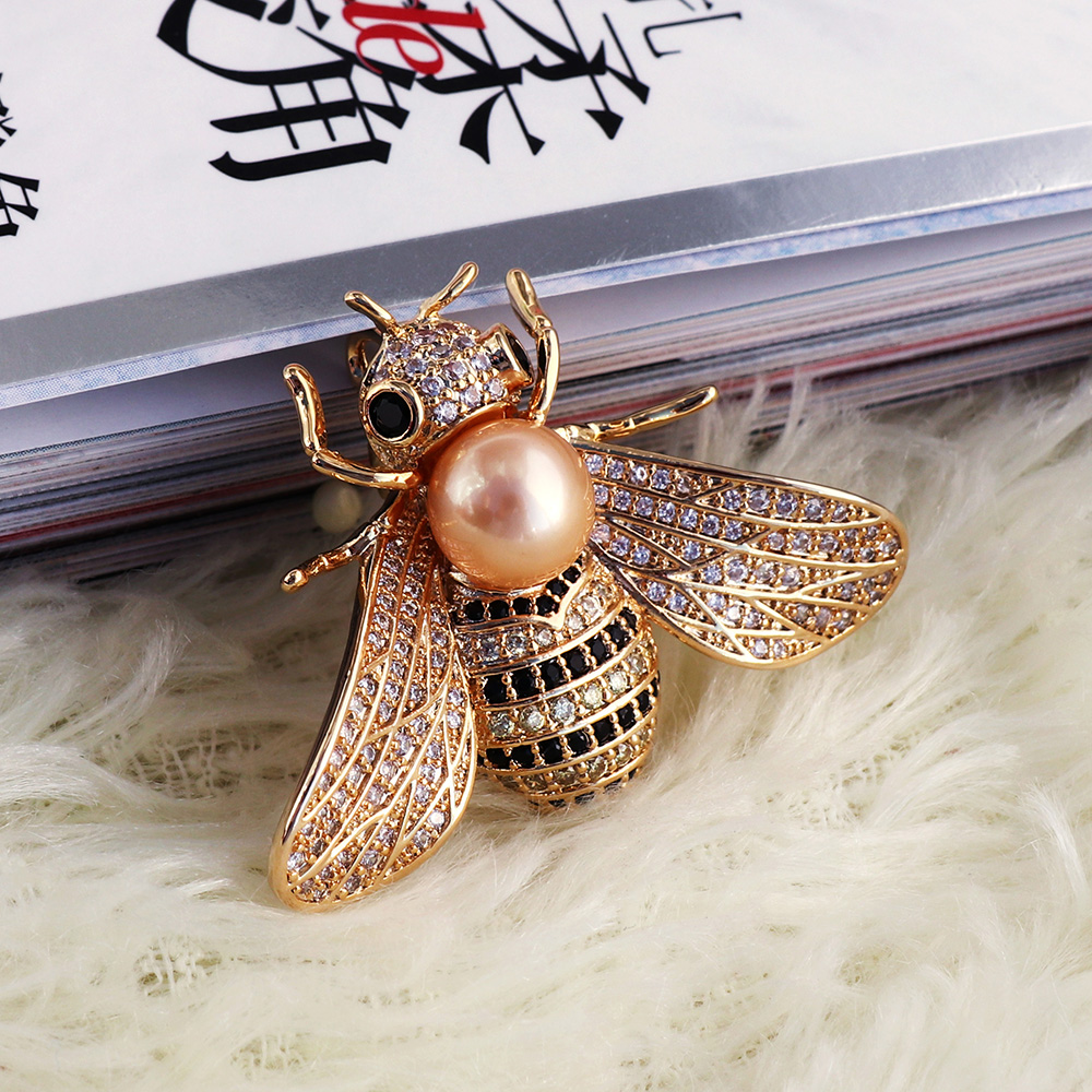 This bee jewelry brooches with pin on the back, also can use to be jewelry pendant. The modern design bee brooch just like a lifelike bee gentle stand on chest. This whole jewelry brooch main material is Alloy and bezel setting with many glitter CZ zircon stone, especial the big pearl jewelry on bee head.