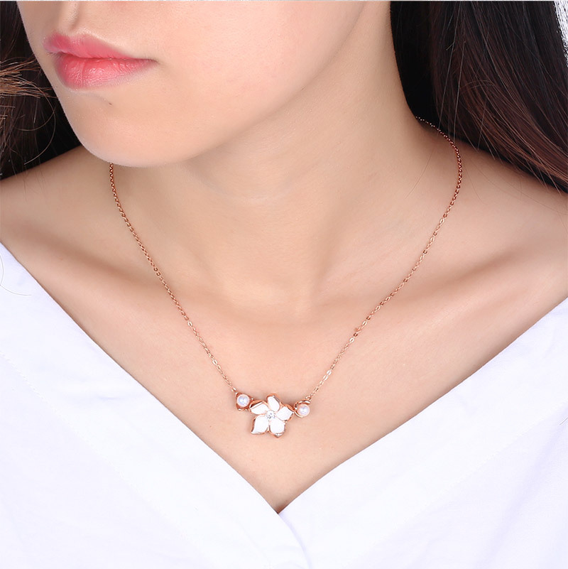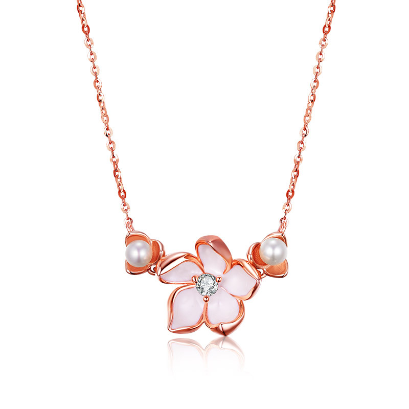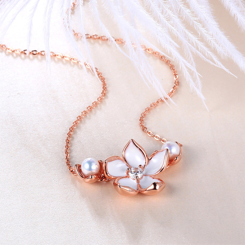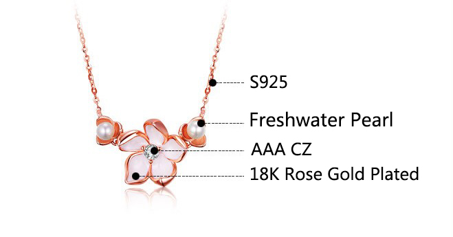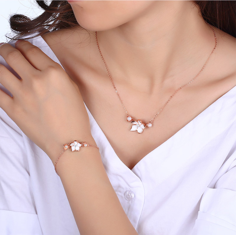 This beautiful and elegant flower design silver pearl necklace and bracelet set features 18K rose gold plating, white freshwater pearl and AAA CZ zircon stone.