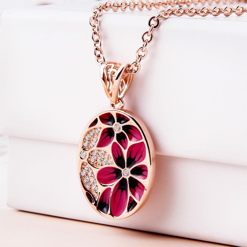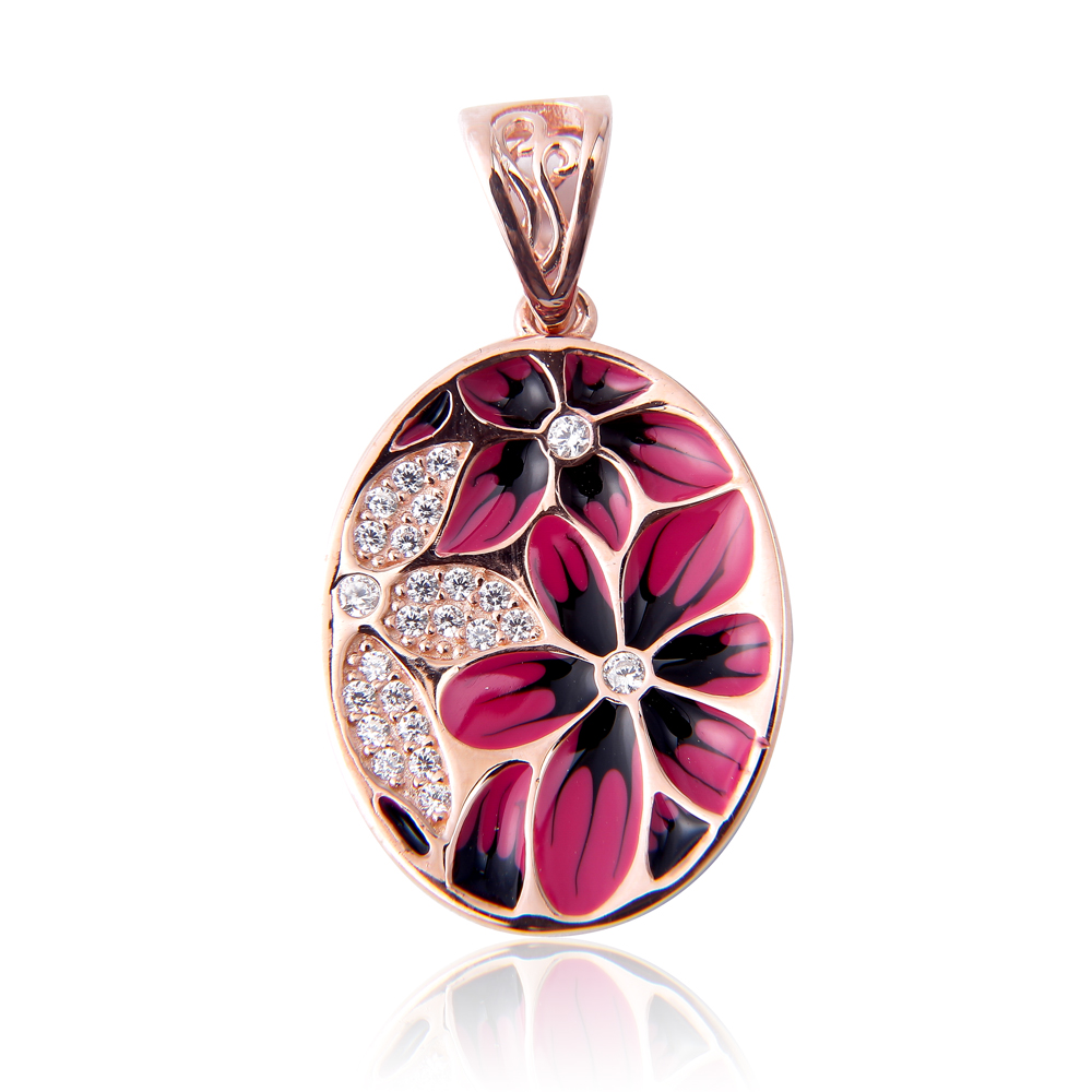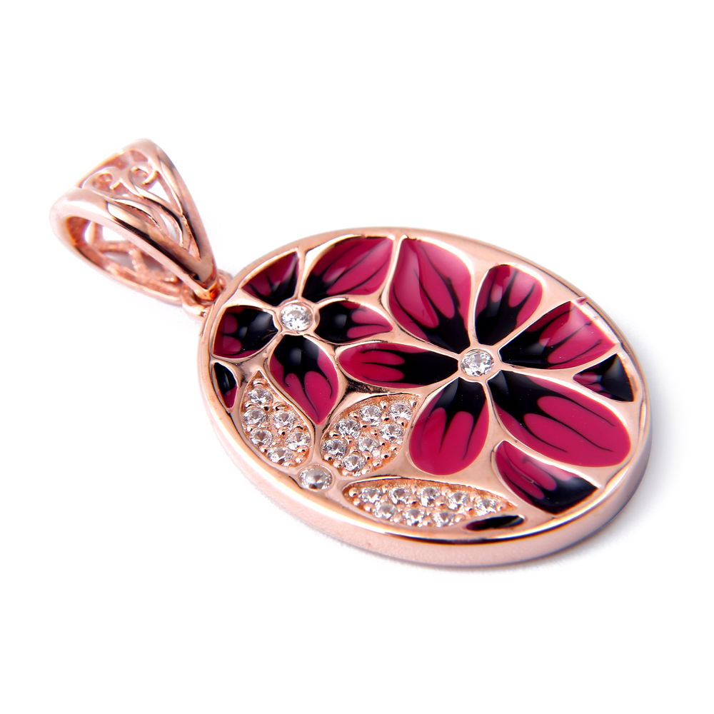 Pendant Necklaces925 Sterling Silver Jewelry Pendant with Enamel Craft and 18K Rose Gold Plated, Setting with 3pcs Big Zircon Stone as Flower Pistil. The Whole Jewelry Pendant Looks Like as An Art Product.