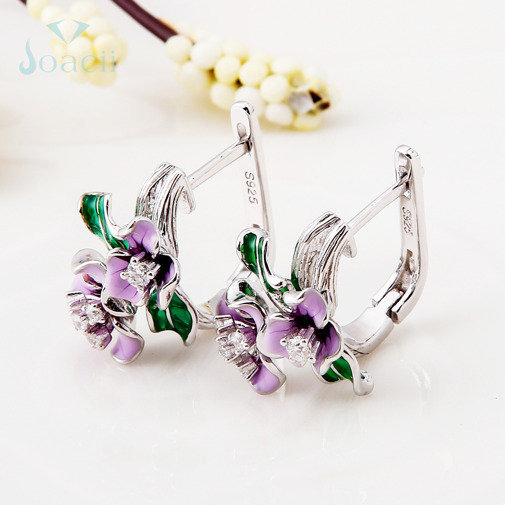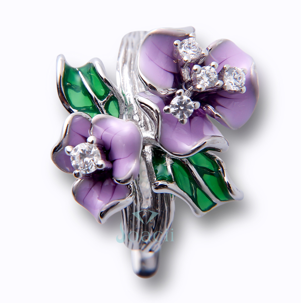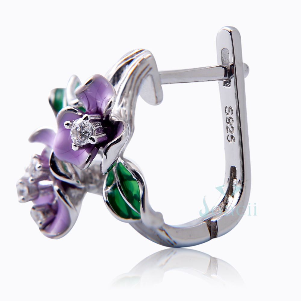 The purple flower enamel silver stud earring is made of S925 sterling silver and setting with AAA CZ stone. Handmade enamel crafts makes it more vivid and beautiful.