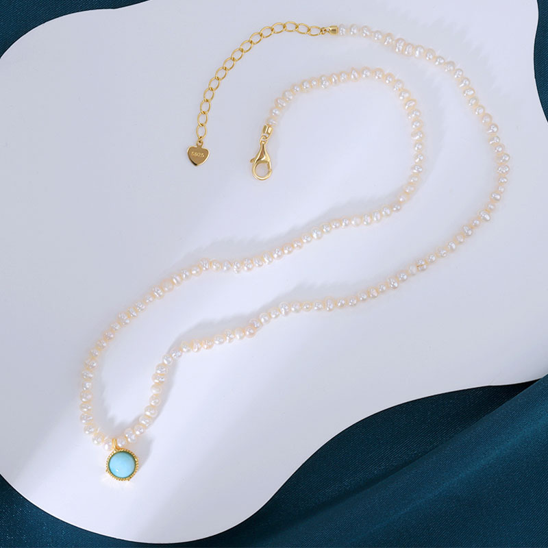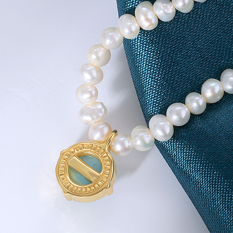 The freshwater pearl necklace is crafted in 925 sterling silver real gold plated with fine jewelry craft.