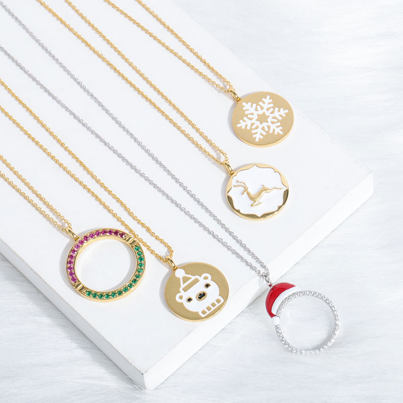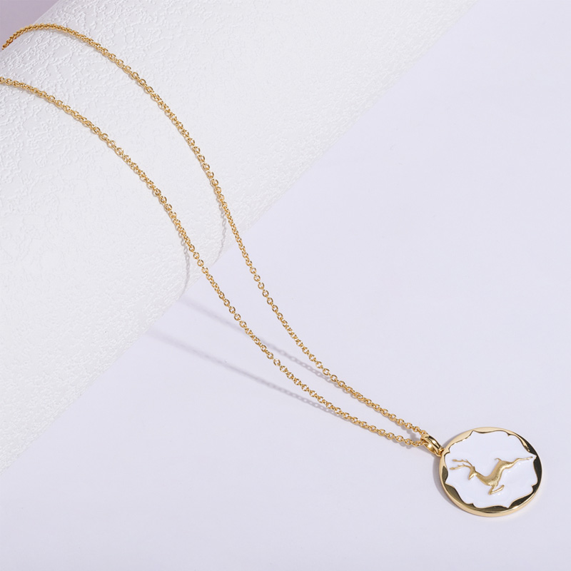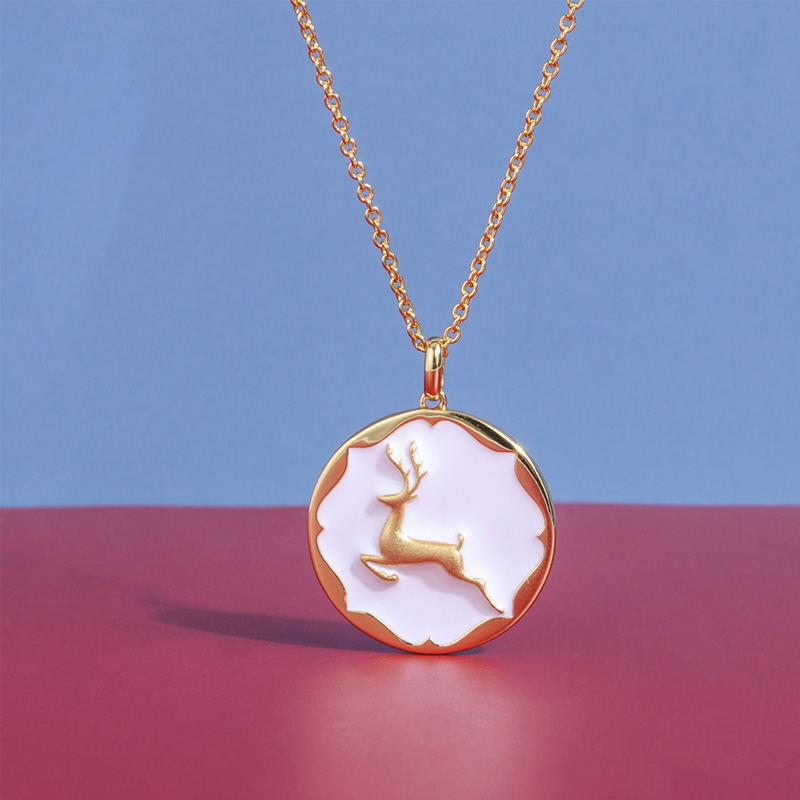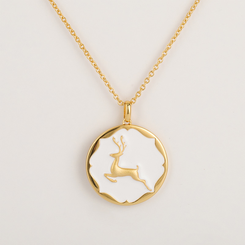 The reindeer necklace is crafted in 925 sterling silver 18k yellow gold plated with fine jewelry craft. Matte effect on the reindeer and back of the disc pendant.
