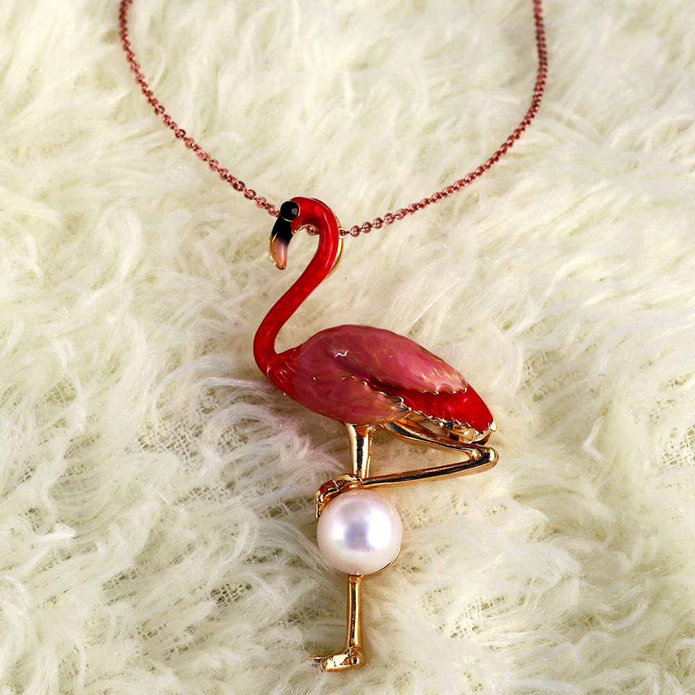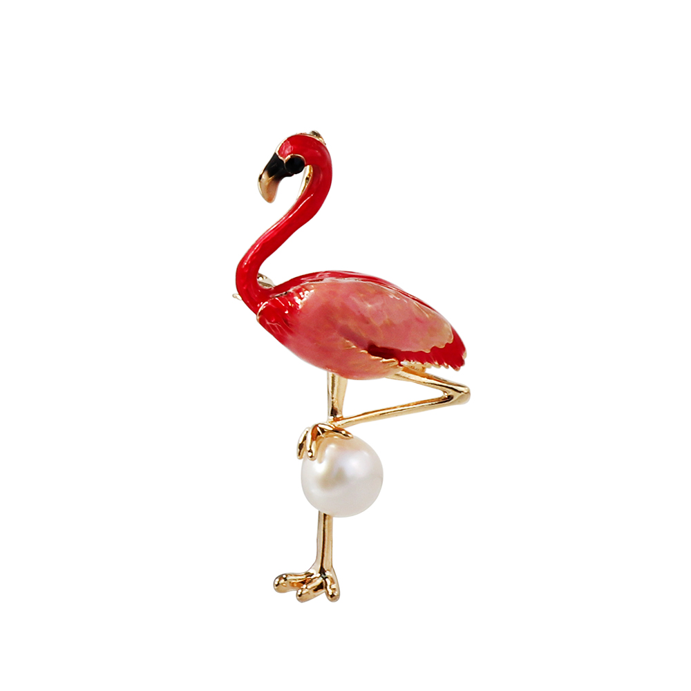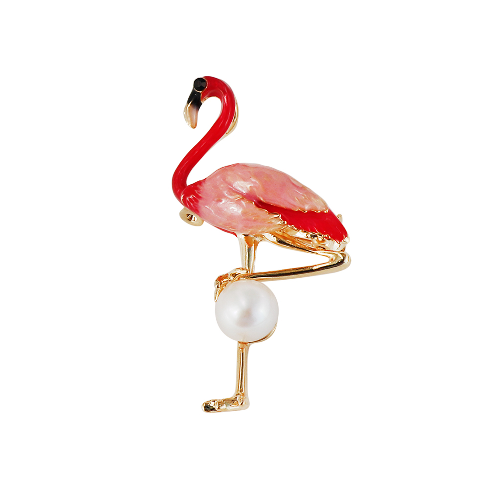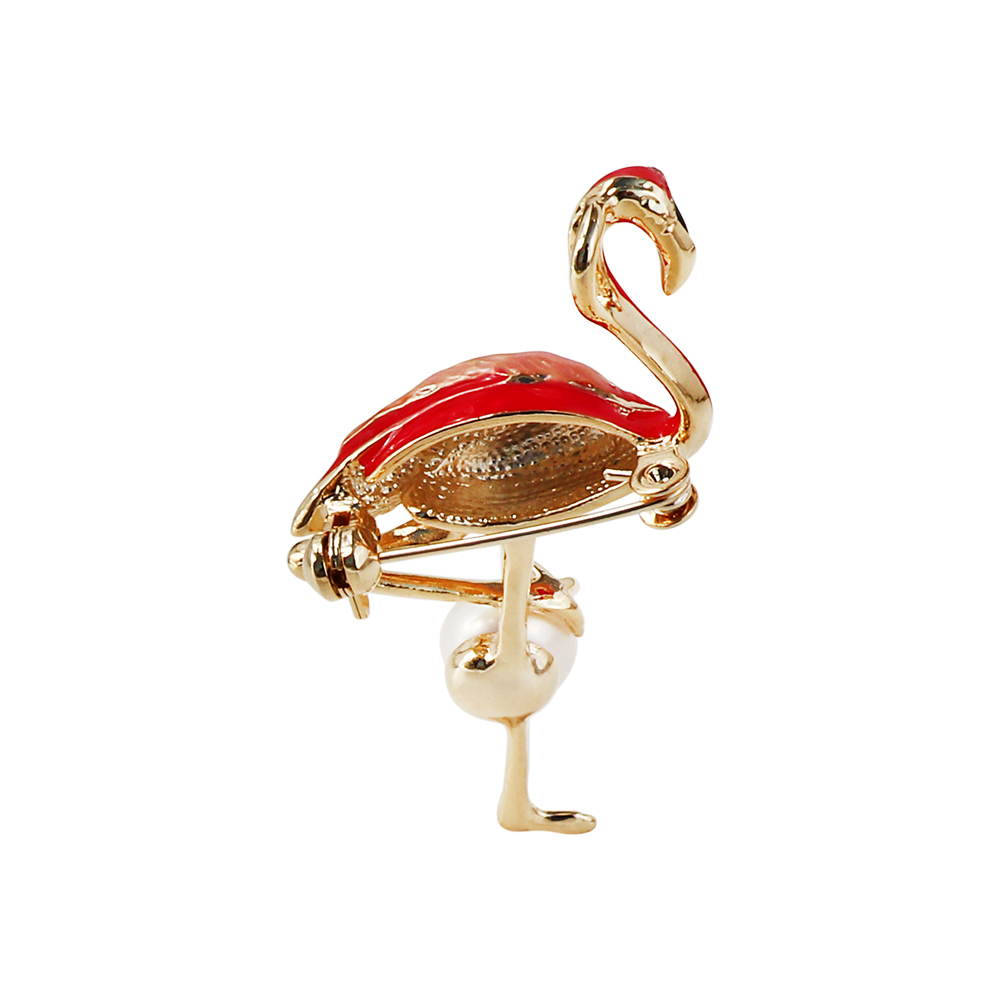 This fashion flamingo jewelry brooches with a secure pin on the back, also can use to be jewelry pendant. The modern design flamingo brooch just like a flamingo stand on one leg to completely control their thaten. This whole jewelry brooch main material is Alloy and bezel setting with many glitter CZ zircon stone, especial the big pearl jewelry on flamingo leg below.