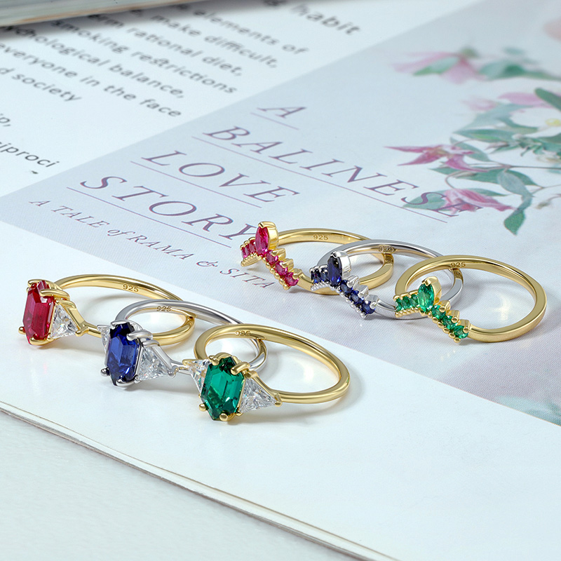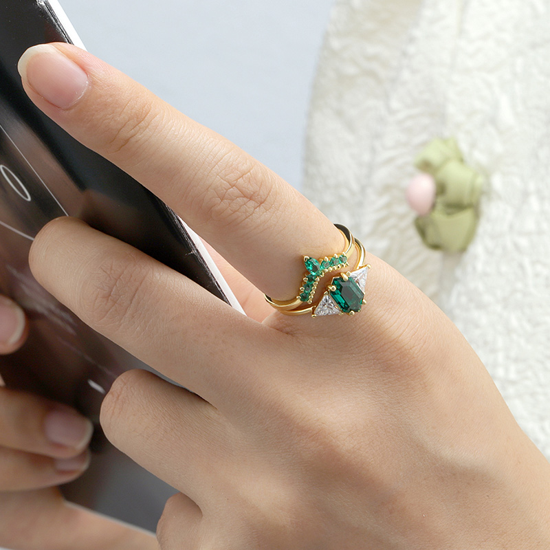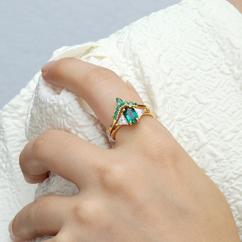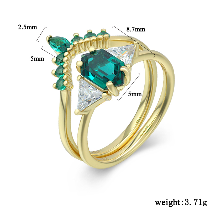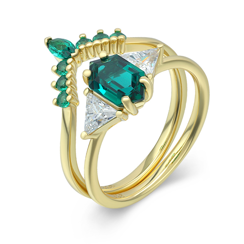 The Hexagon Lab Grown Emerald Ring Set is crafted in 925 sterling silver gold plated with fine jewelry craft.