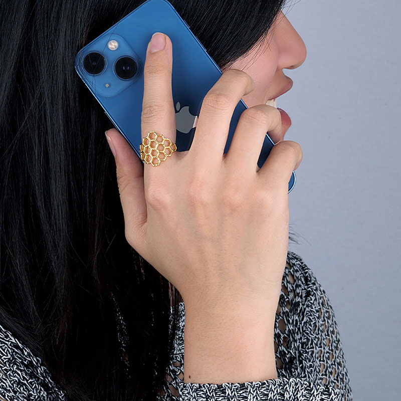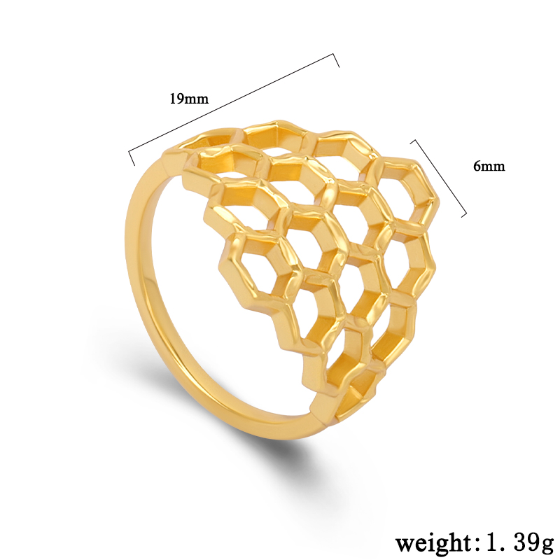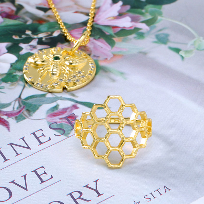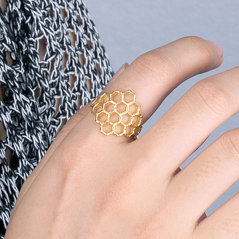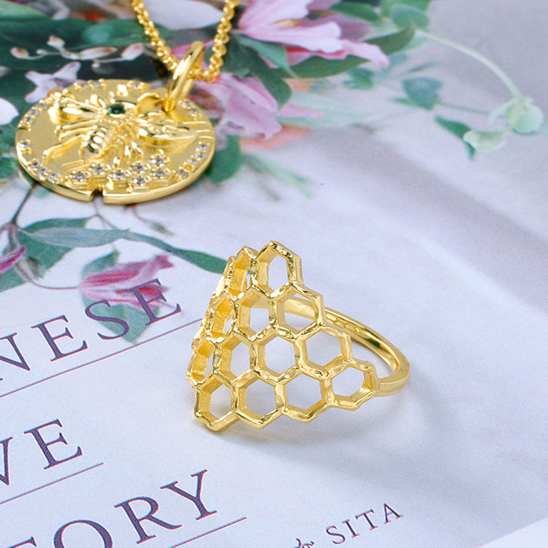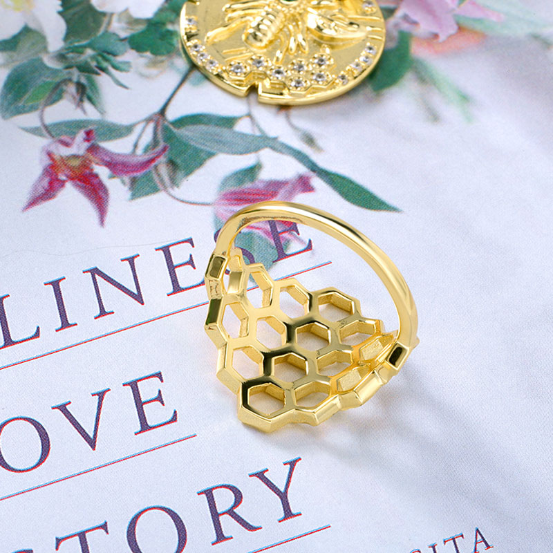 The honeycomb ring is crafted in 925 sterling silver real gold plated with fine jewelry craft.