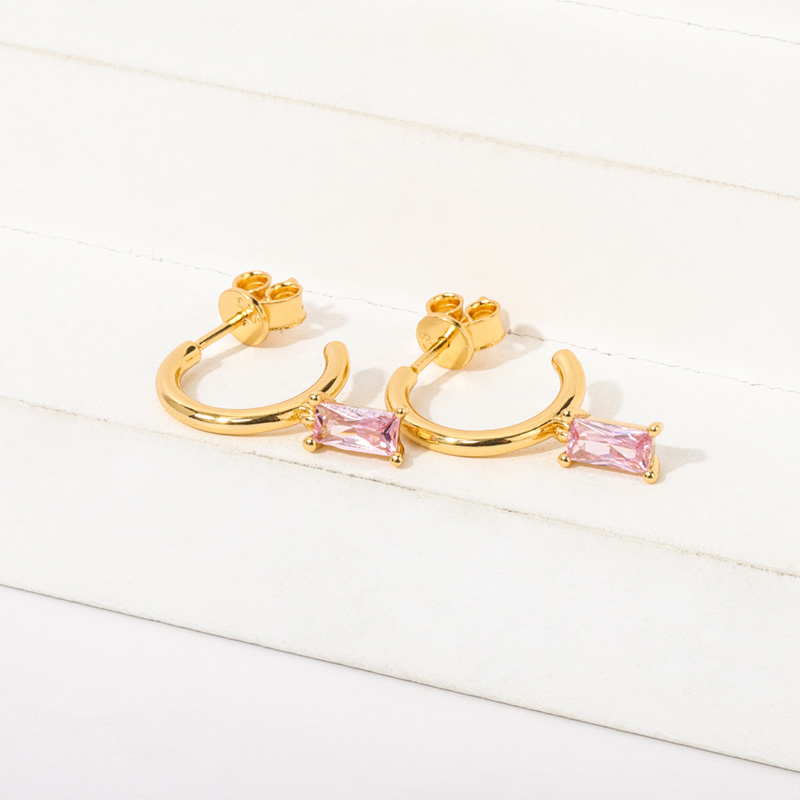 The small earrings are in classic huggie hoop style. The zircons set on the earring make it three-dimensional and shining.