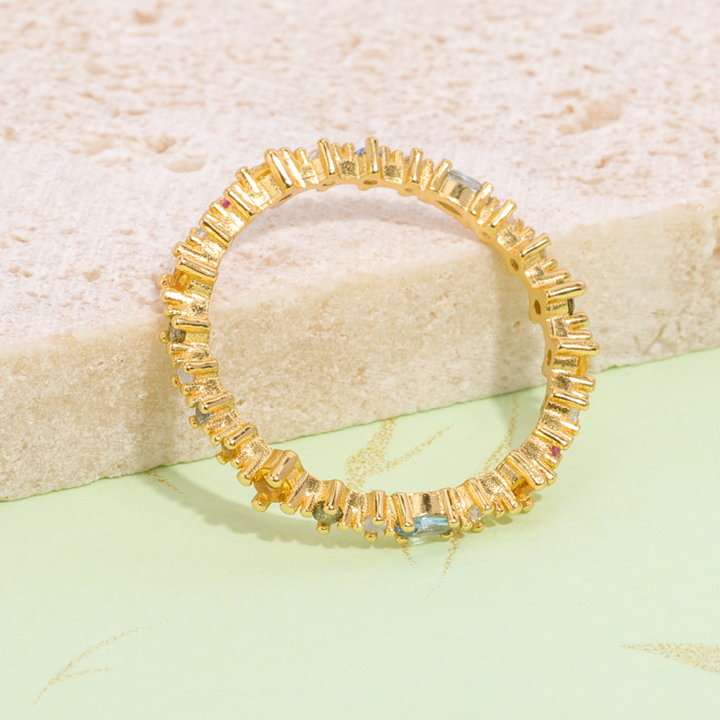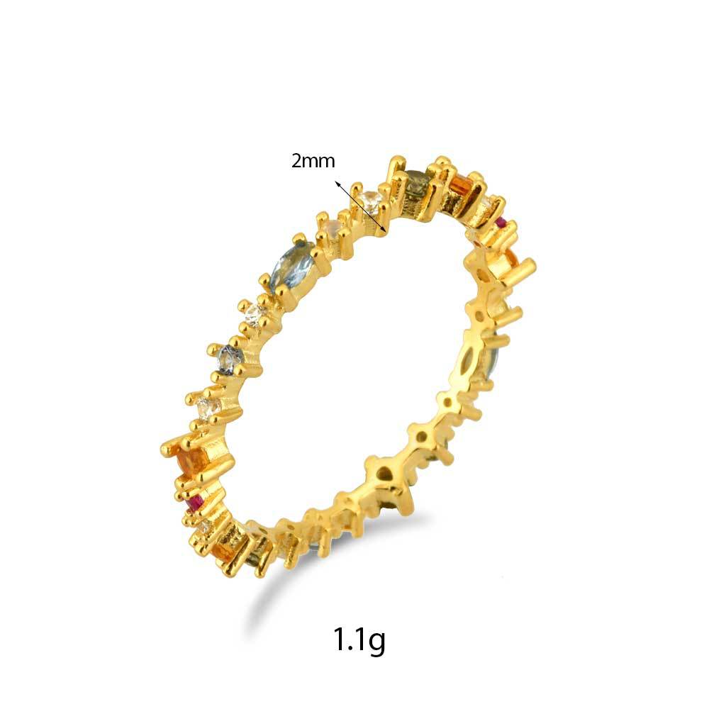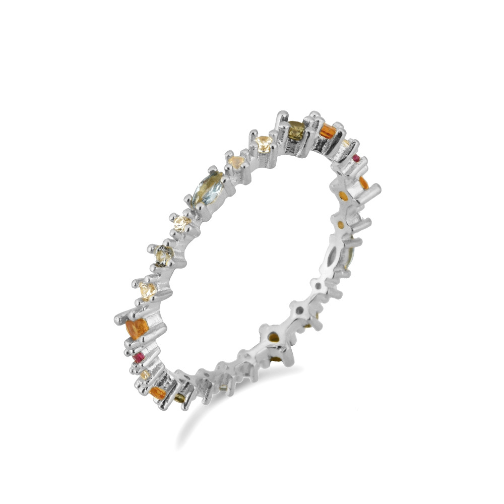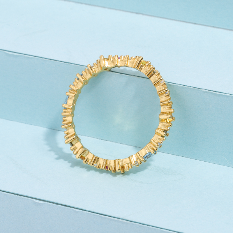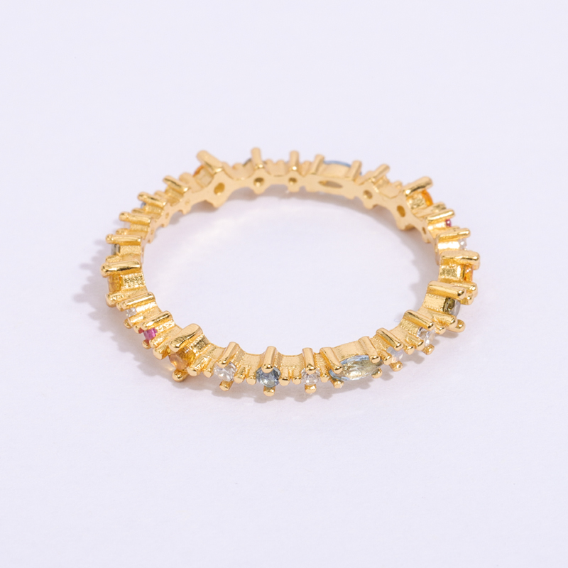 The difference between this ring and the classic infinity ring is that it is an extension, and in addition to the colorful zircons, its shank is irregularly shaped, breaking the rules and giving this ring a different charm.