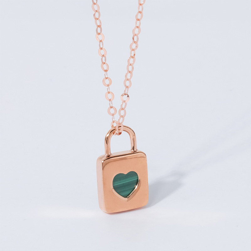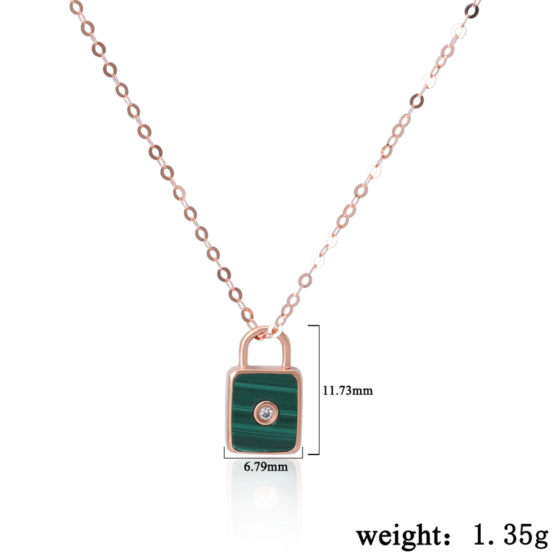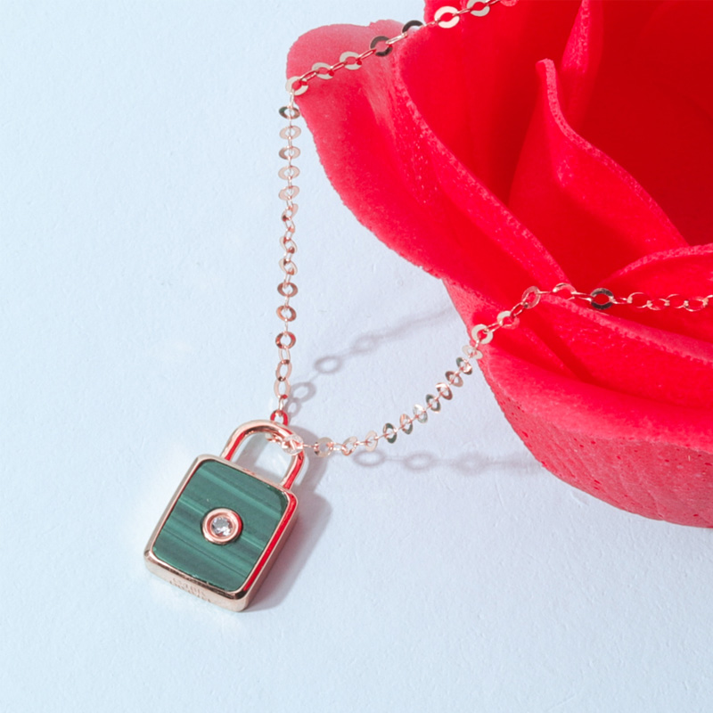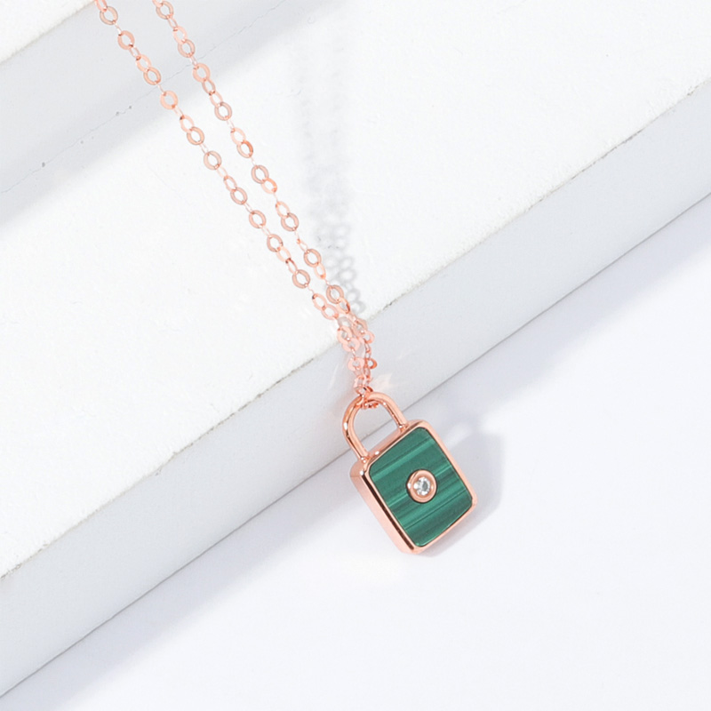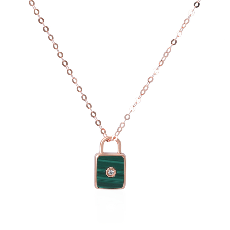 The malachite stone necklace is crafted in 18k rose gold with real malachite. Bezel set diamond with fine jewelry craft.