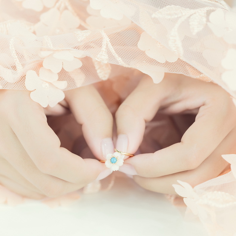 The flower ring fine jewelry is made of 925 sterling silver in base, and mother of pearl with 5 petals. Green turquoise in central for stamen.