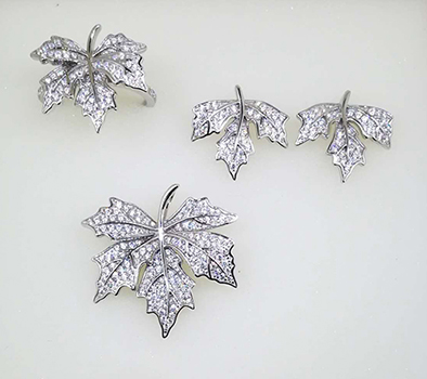 The unique jewelry design as maple leaf shape and pave setting with brightness cubic zircon. Whole jewelry set including ring, earrings and pendant necklace.