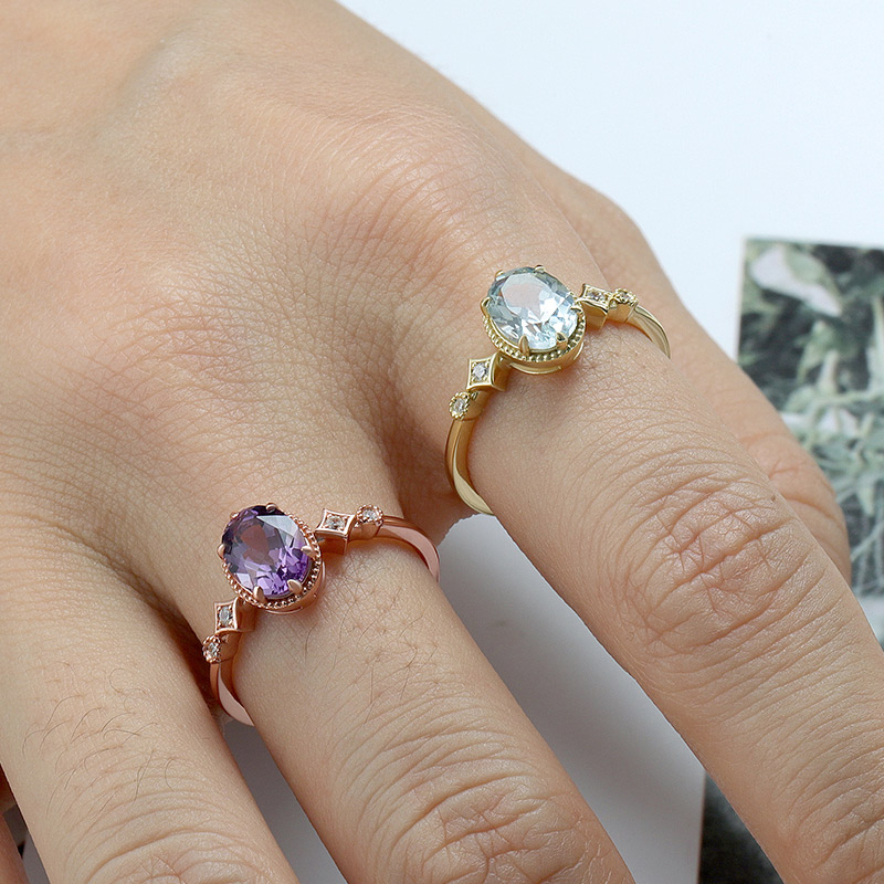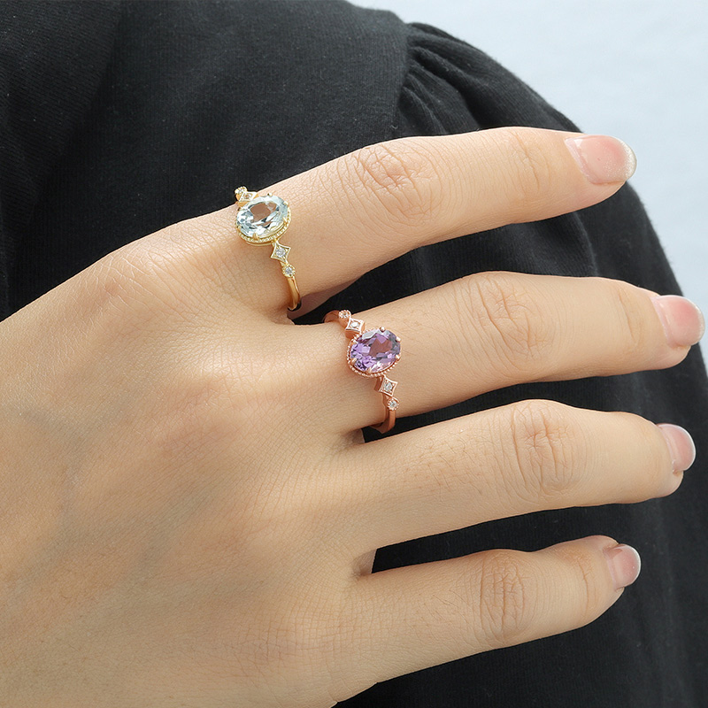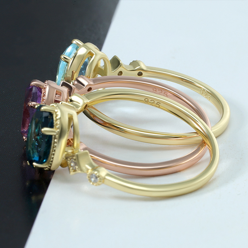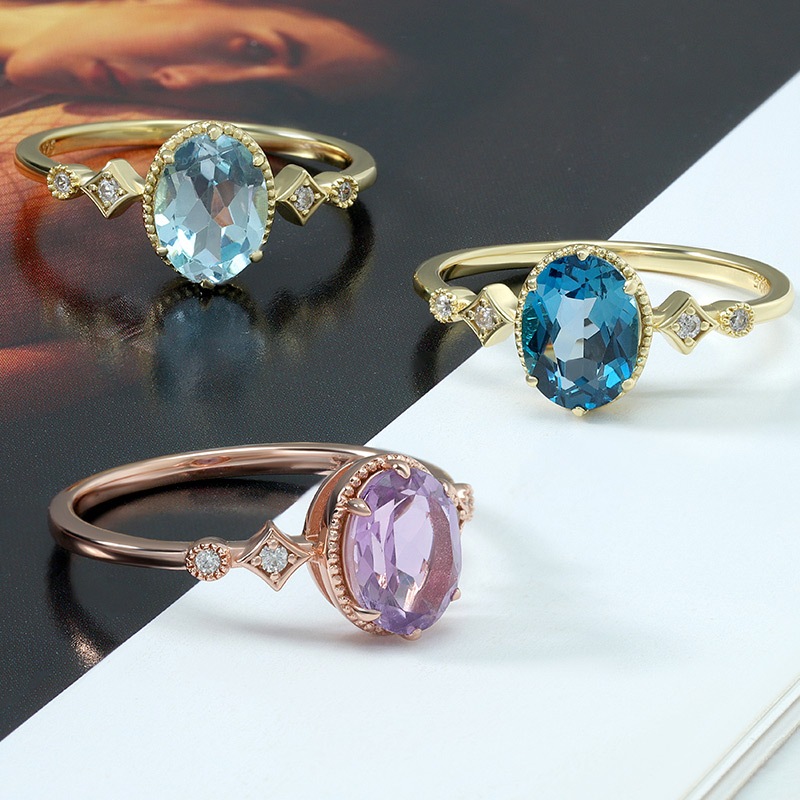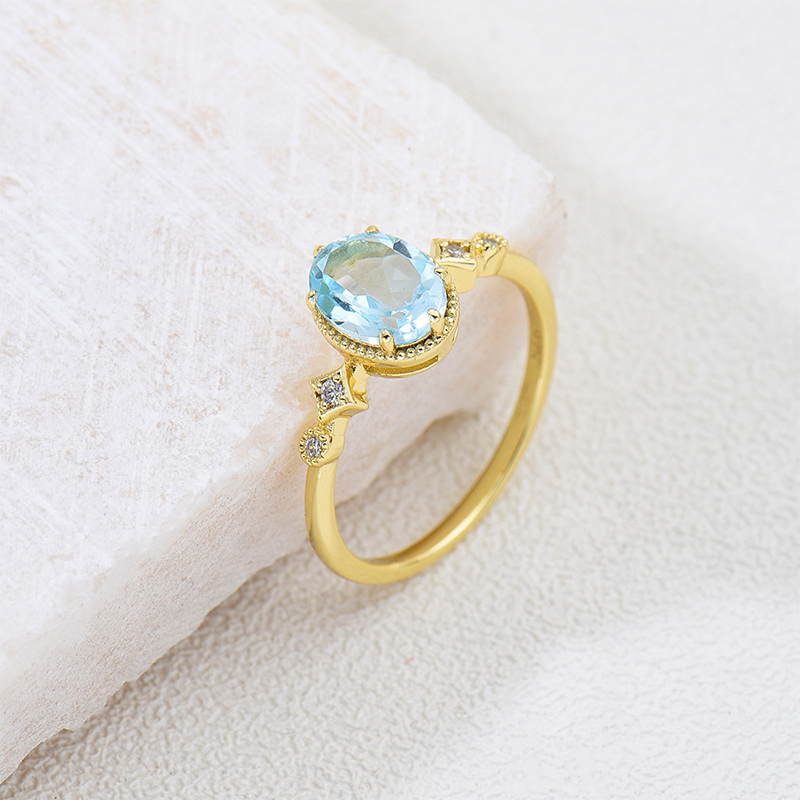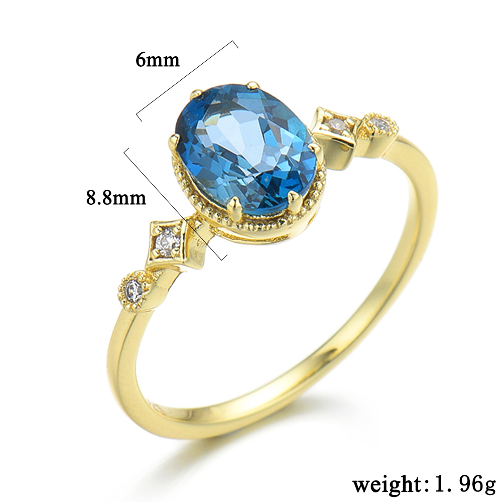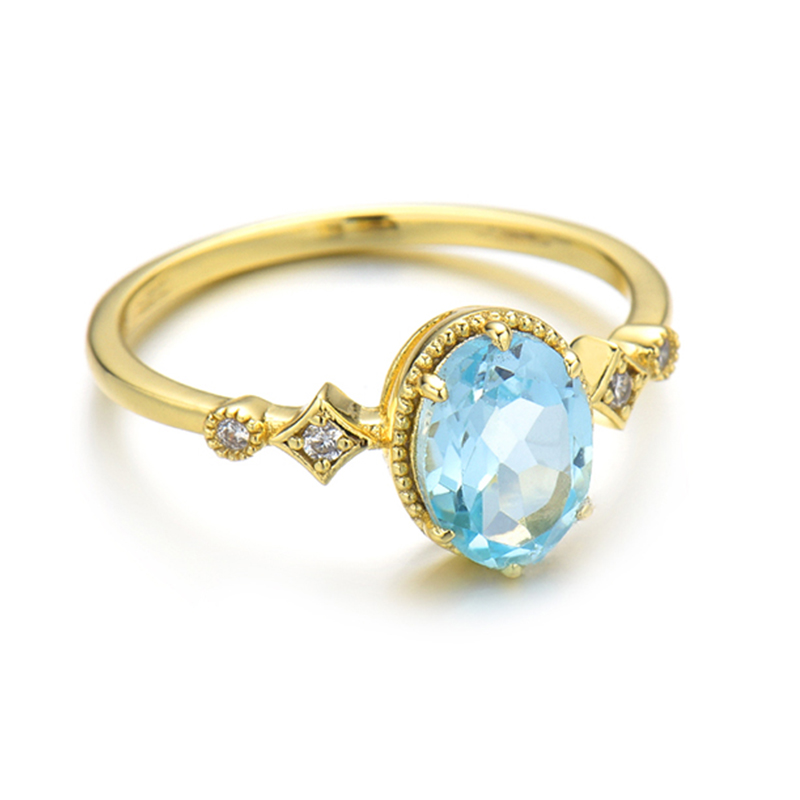 The oval blue topaz ring is crafted in 925 sterling silver 14K gold plated with fine jewelry craft.
