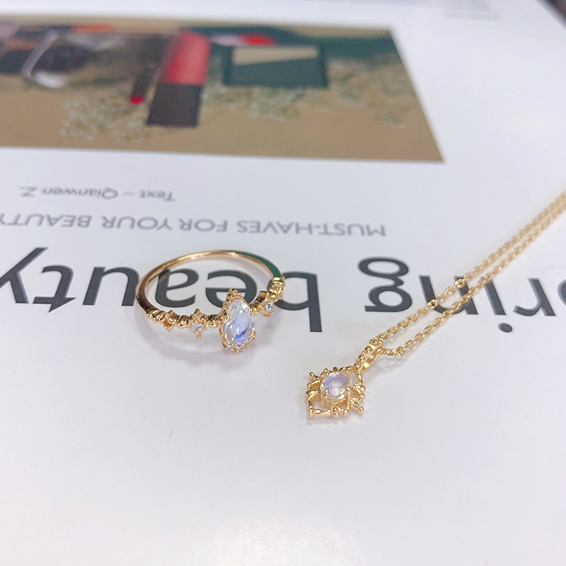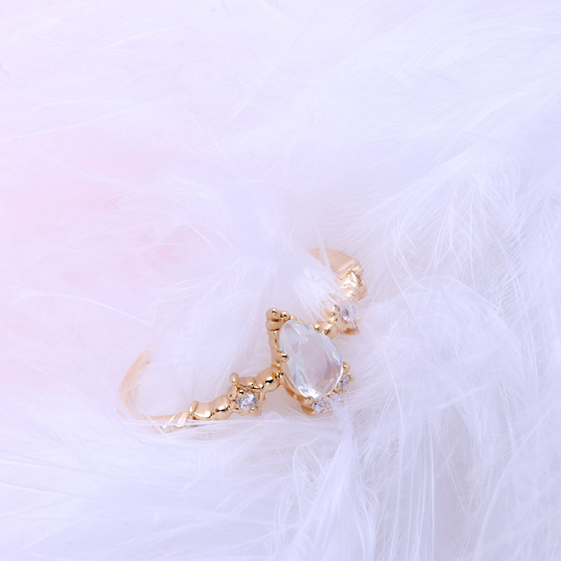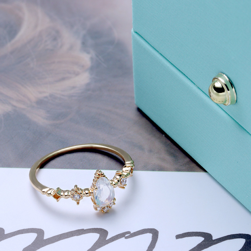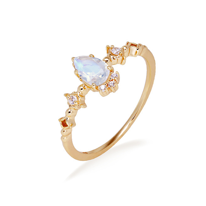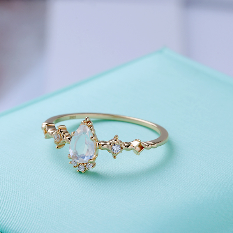 The pear shaped moonstone engagement ring is crafted in 925 sterling silver 14k yellow gold plated with fine jewelry craft.