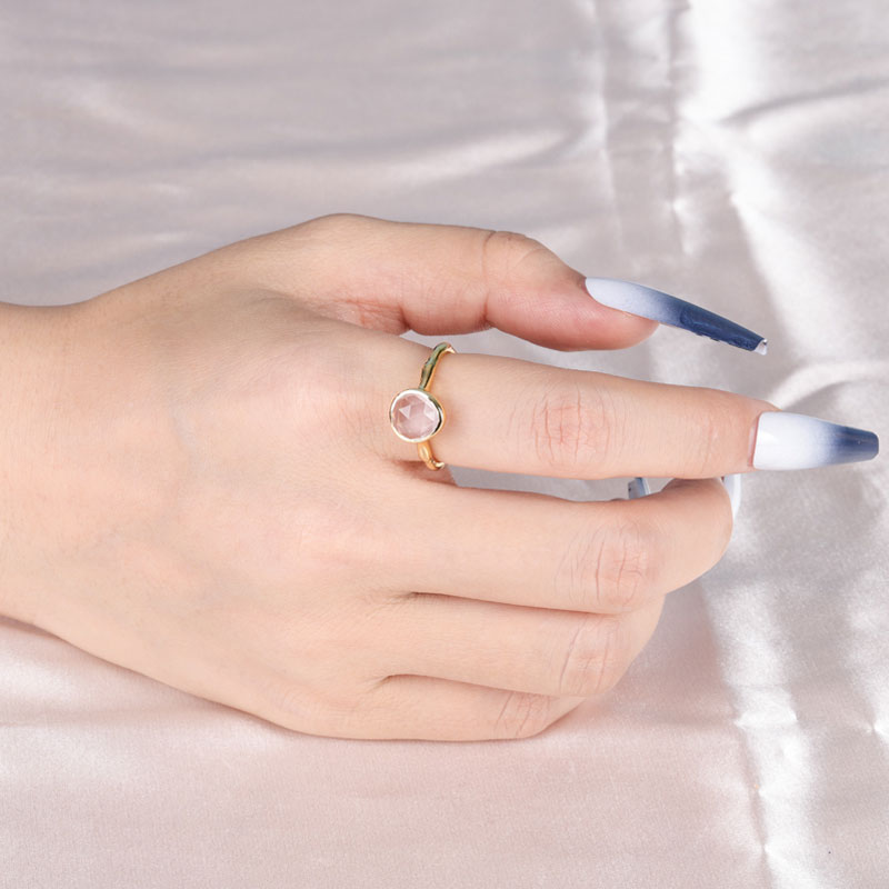 The rose quartz stone ring is crafted in 925 sterling silver 18k yellow gold plated with fine jewelry craft.