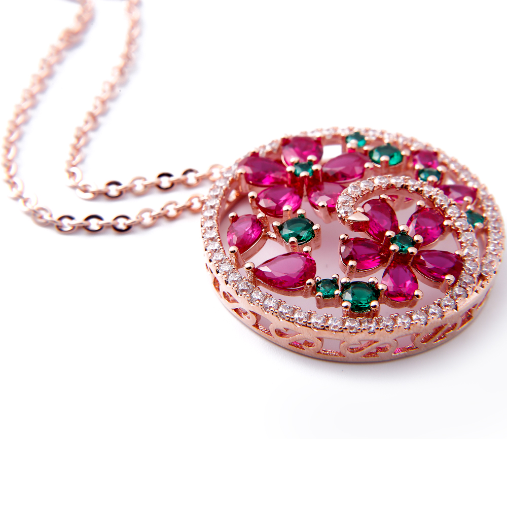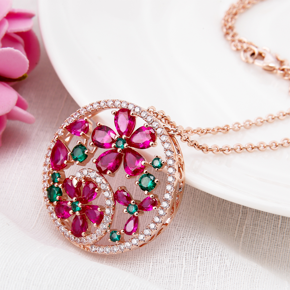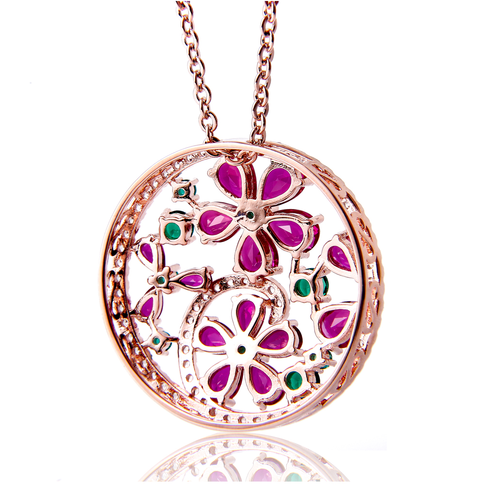 Pendant Necklaces18K rose gold plated Jewelry pendant necklace with ruby stone and green glass to be flower shape. And the cz zircon around the flower design make the pendant products in quality and beautiful.