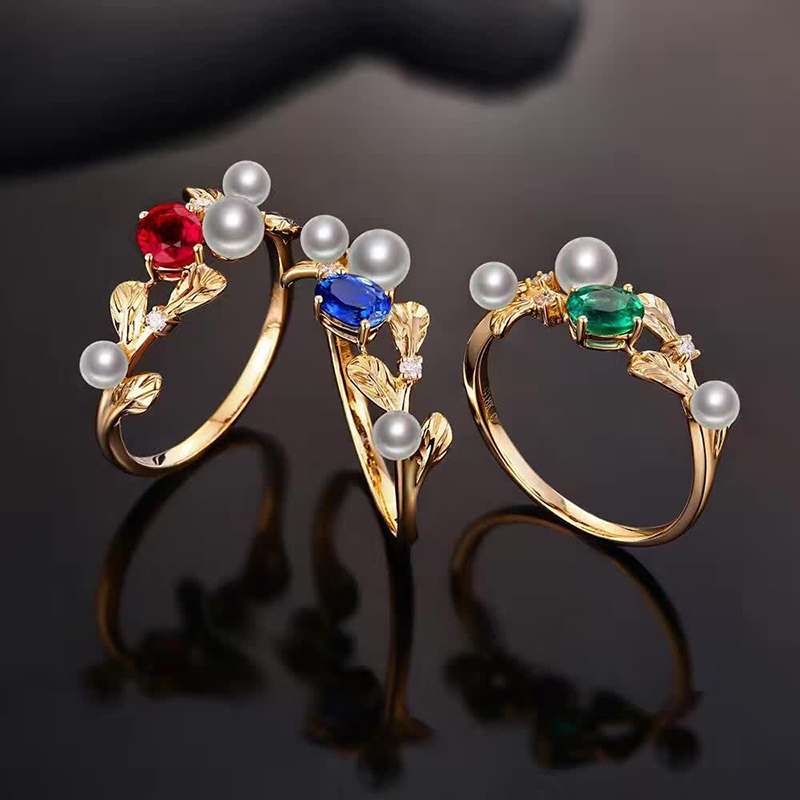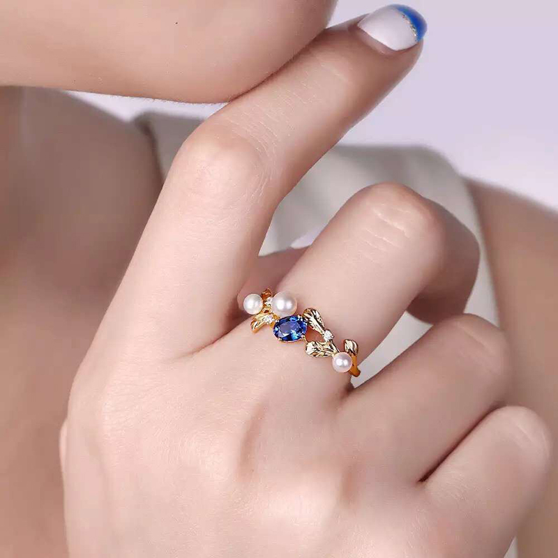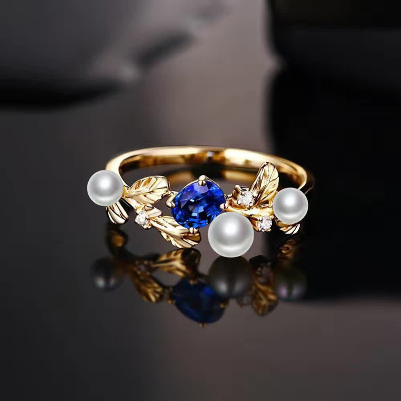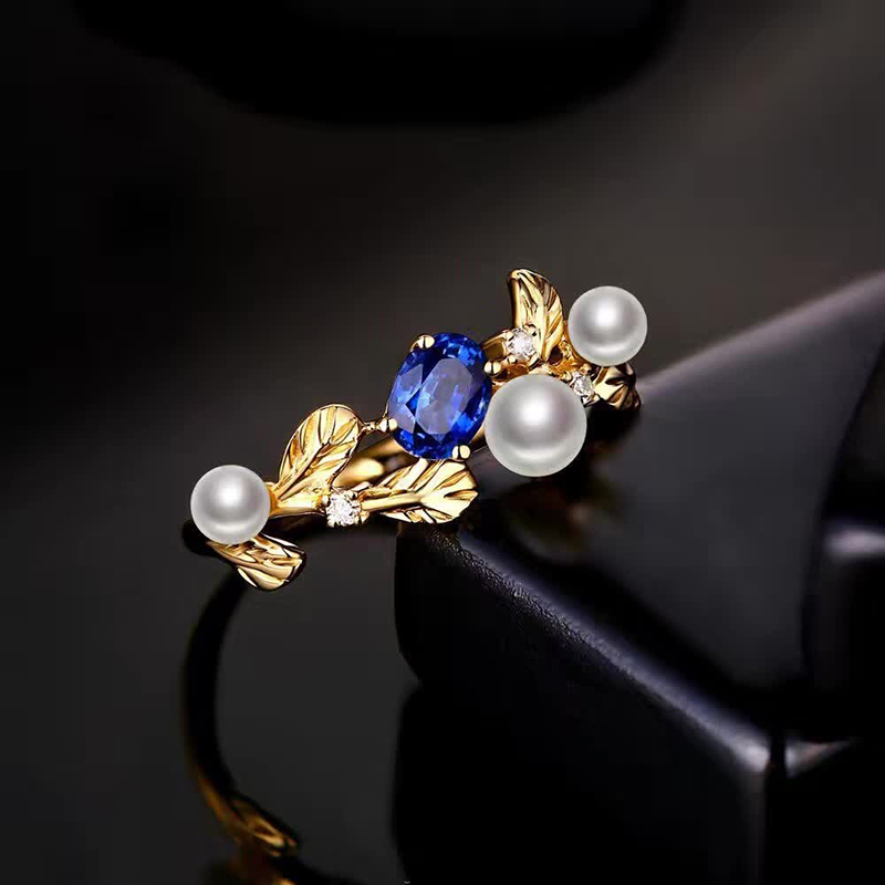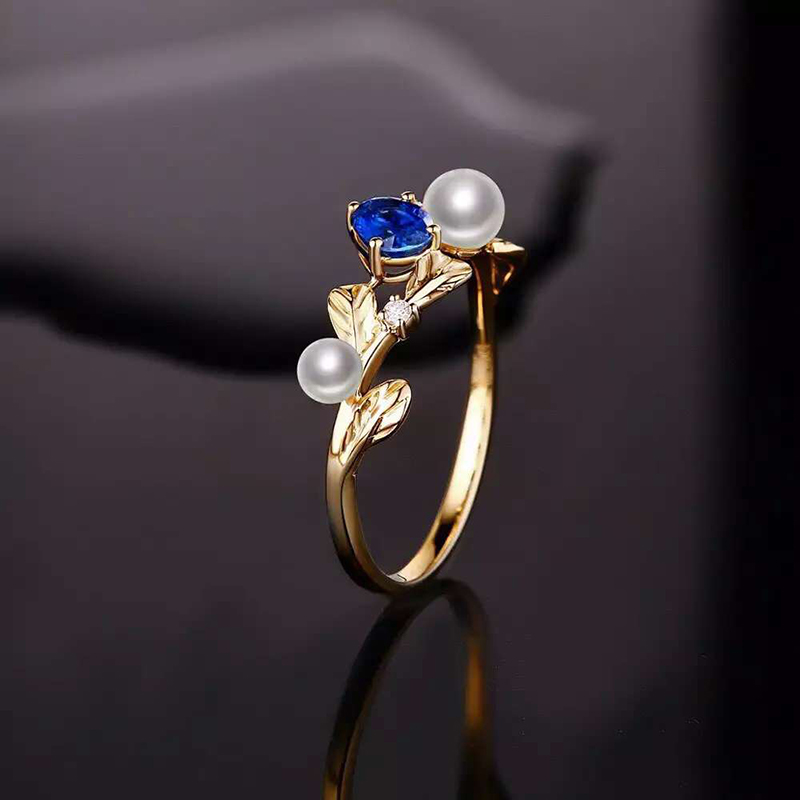A beautiful wedding ring design with three stone of freshwater pearl, sapphire and cubic zircon on 18K gold plated 925 sterling silver. The sapphire stone can be change to emerald, ruby stone.