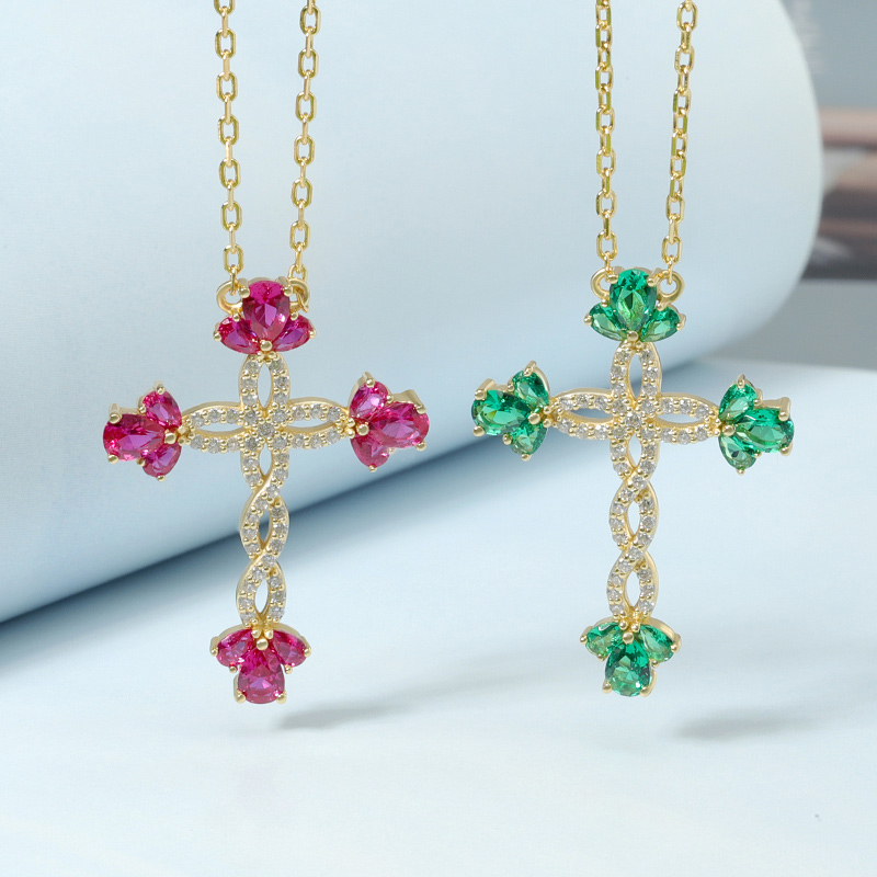 AvailableSimulate Flower Emerald Cross Necklace