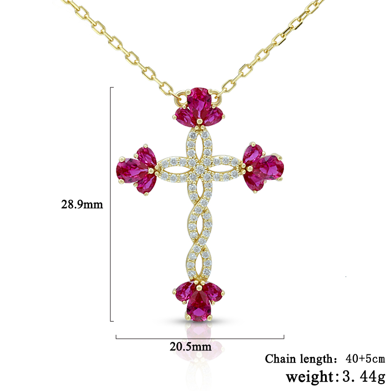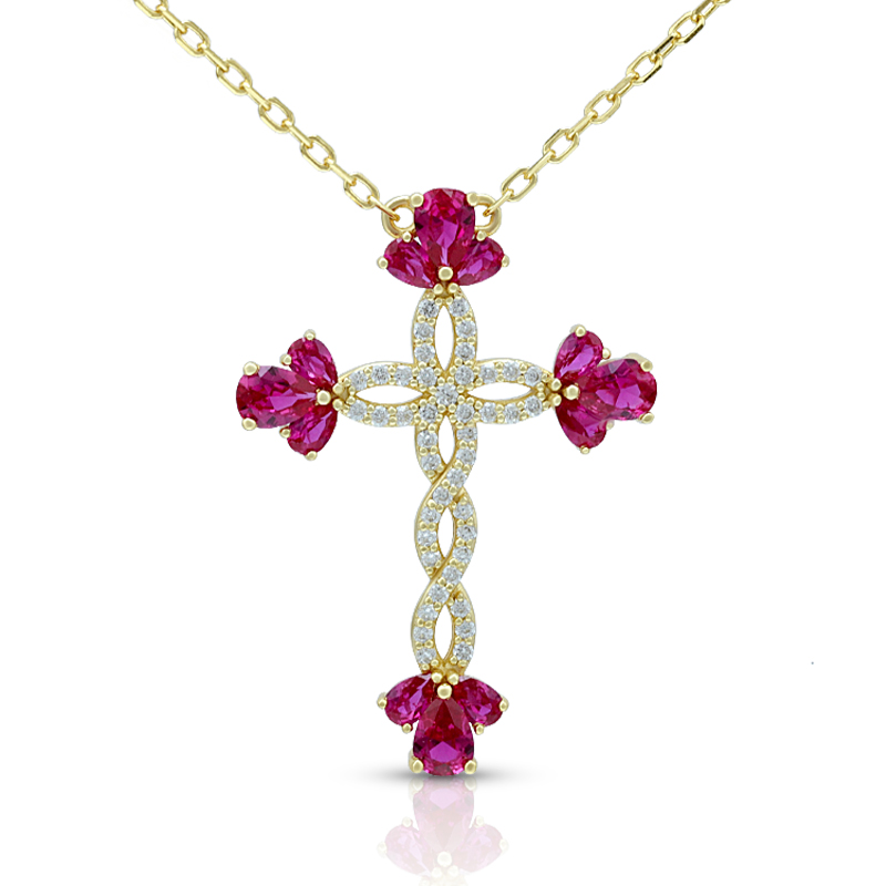 The Simulate Flower Ruby Cross Necklace is crafted in 925 sterling silver gold plated with fine jewelry craft.