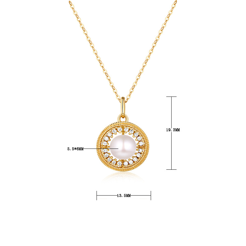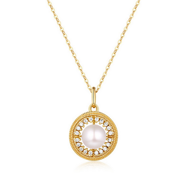 The Pearl Pendant Necklace for lady, it is made of 925 sterling silver in 18K gold plating, round freshwater pearl is encircled by 20 cubic zirconia.