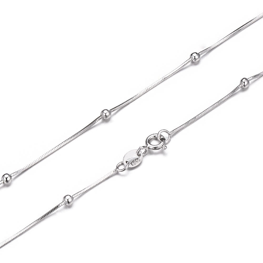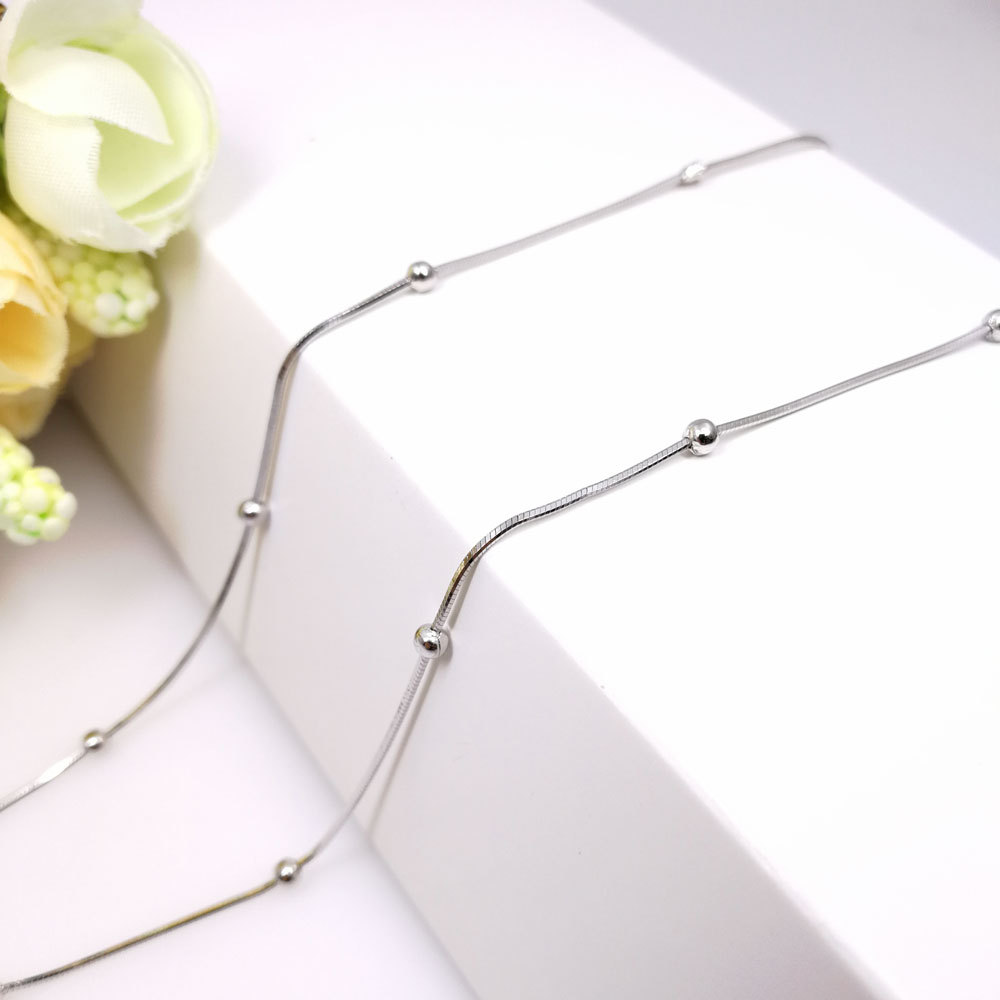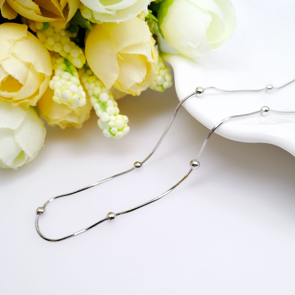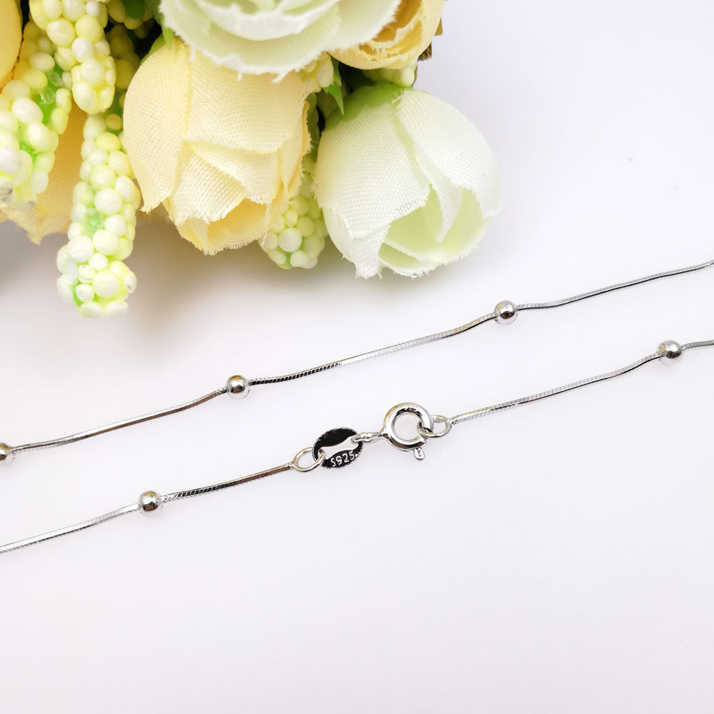 A rich white gold tone enhances the silver beads strung gracefully on the snake chain. The bracelet is secured with a Spring Ring clasp. The chain is set with silver beads every 6cm distance. It is nickle free.