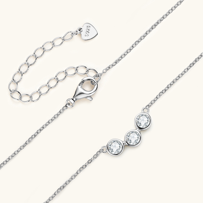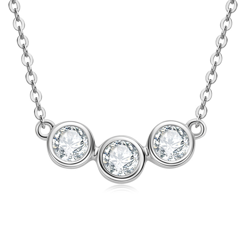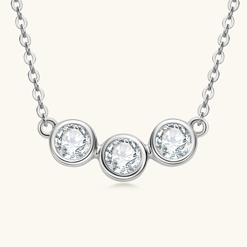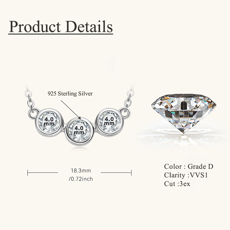 The three stone moissanite necklace is crafted in 925 sterling silver18K white gold plated with fine jewelry craft.
