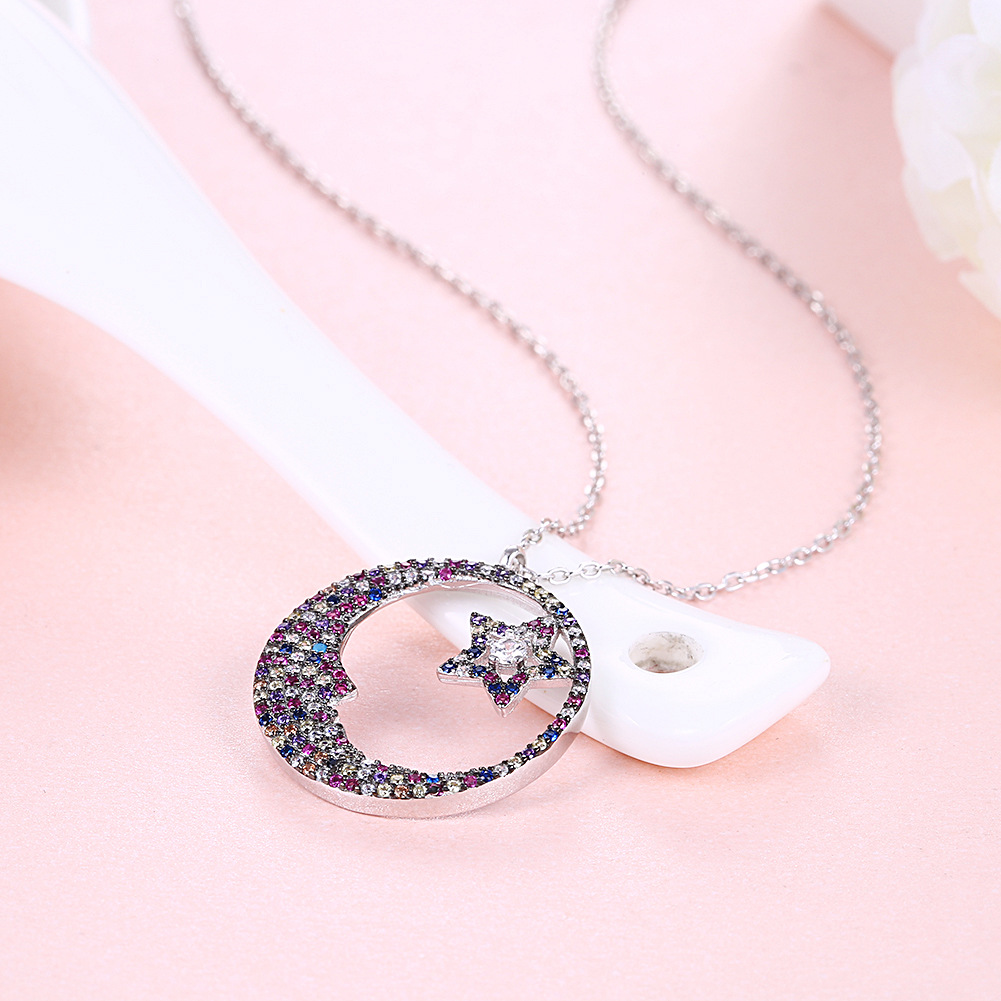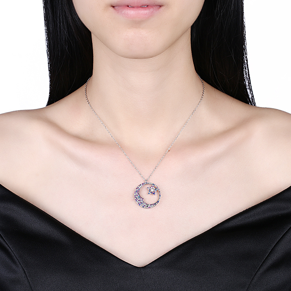 This silver jewelry necklace is hot sale products for women.It is setting with AAA CZ and 18K white gold plated. Main material is sterling silver.Moon and star design is unique and popular with young people.