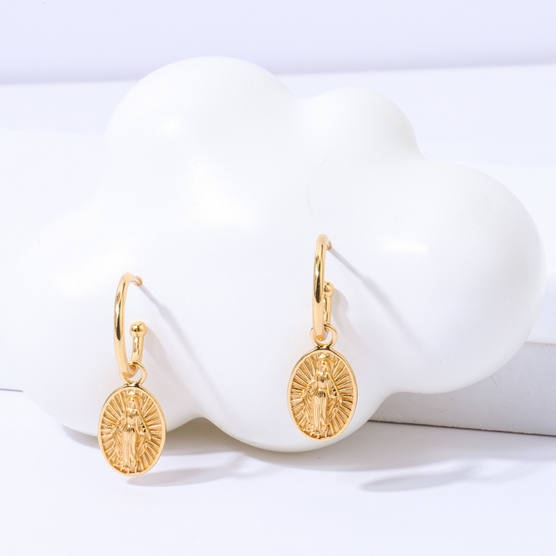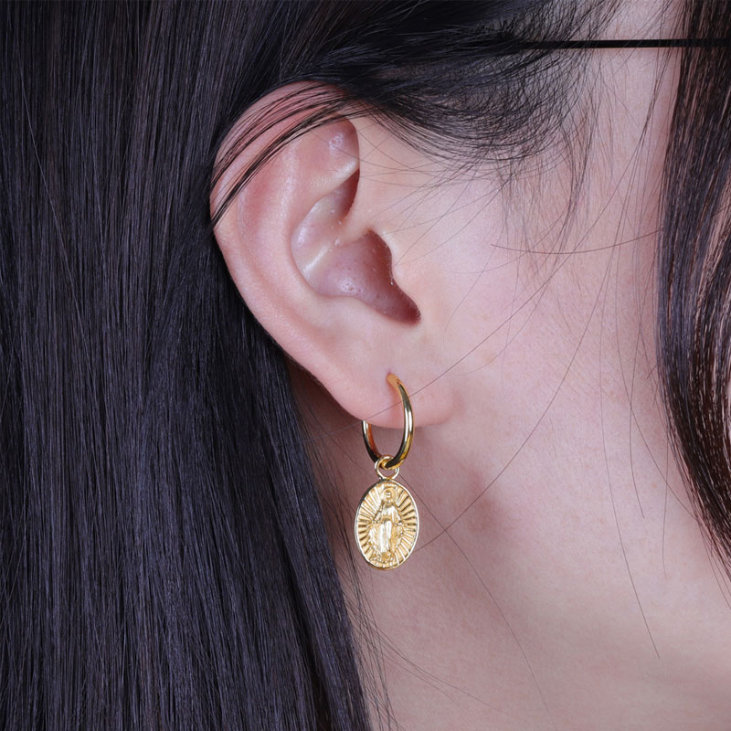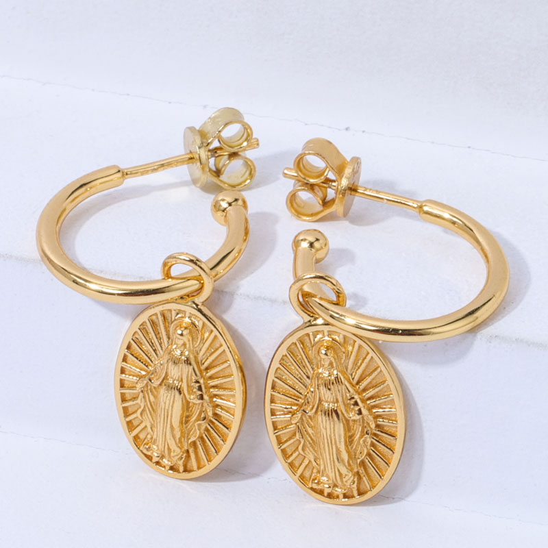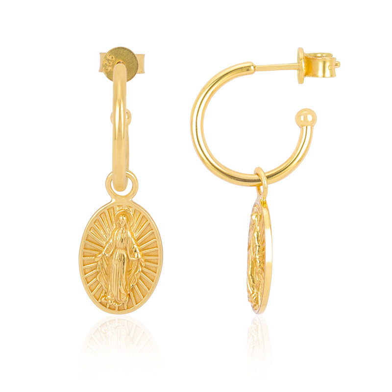The Virgin Mary hoop earring is crafted in 925 sterling silver 18k yellow gold plated with fine jewelry craft.