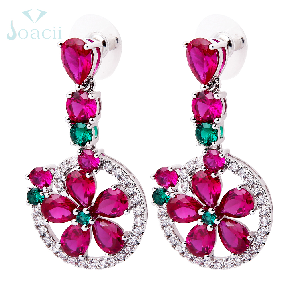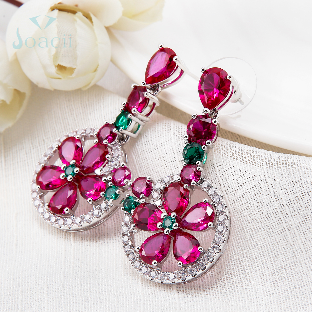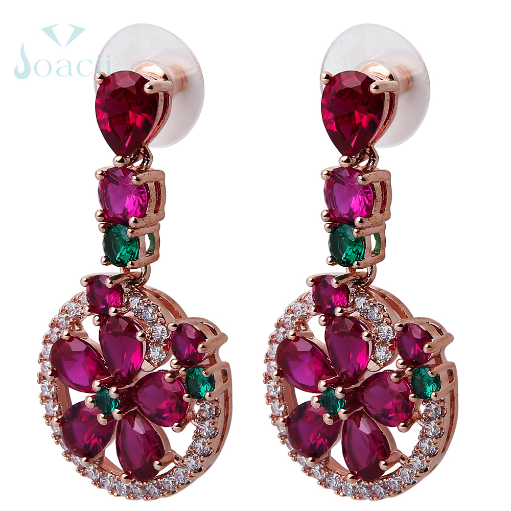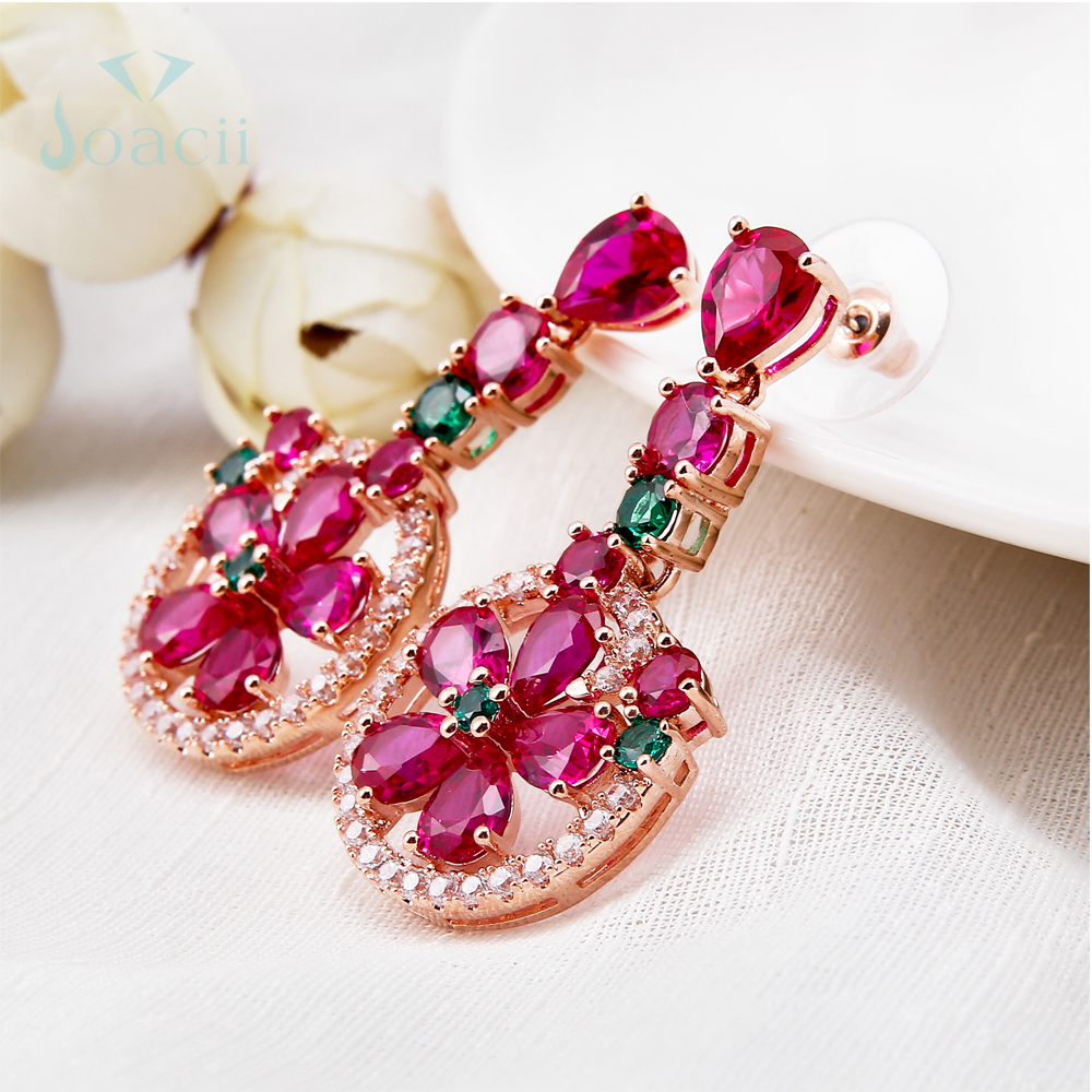 The charming jewelry earrings matched with ruby diamond stone and green glass. Whole drop earring is made of ally copper material, and the color can plated with rose gold, silver, and gold.