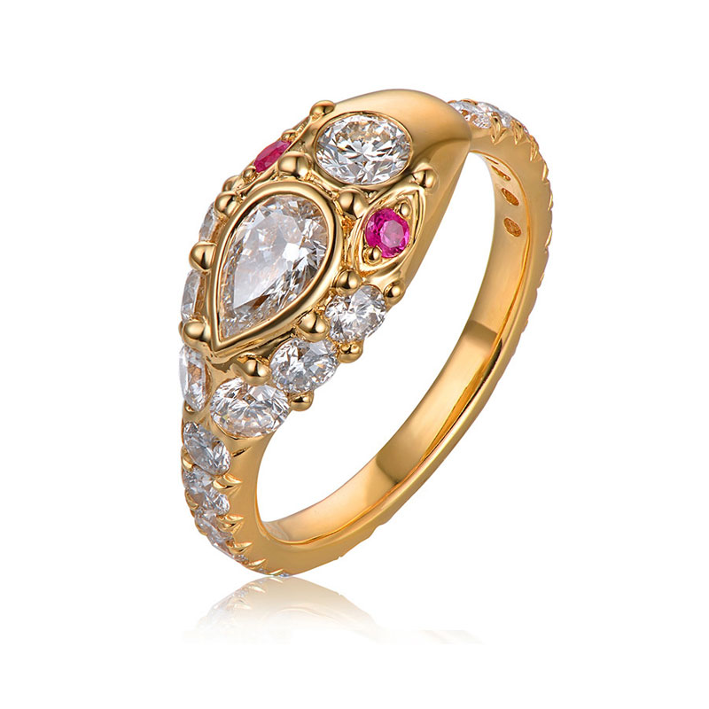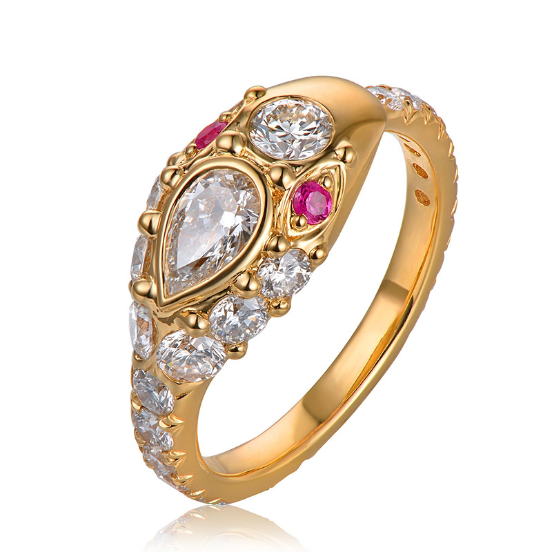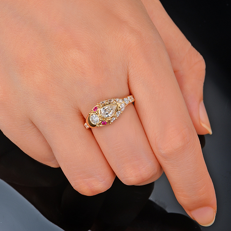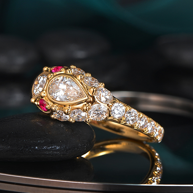 The Engagement Ring fine jewelry bezel setting with 1.81ct luxury diamond in pear cut. 2 round ruby on both side.