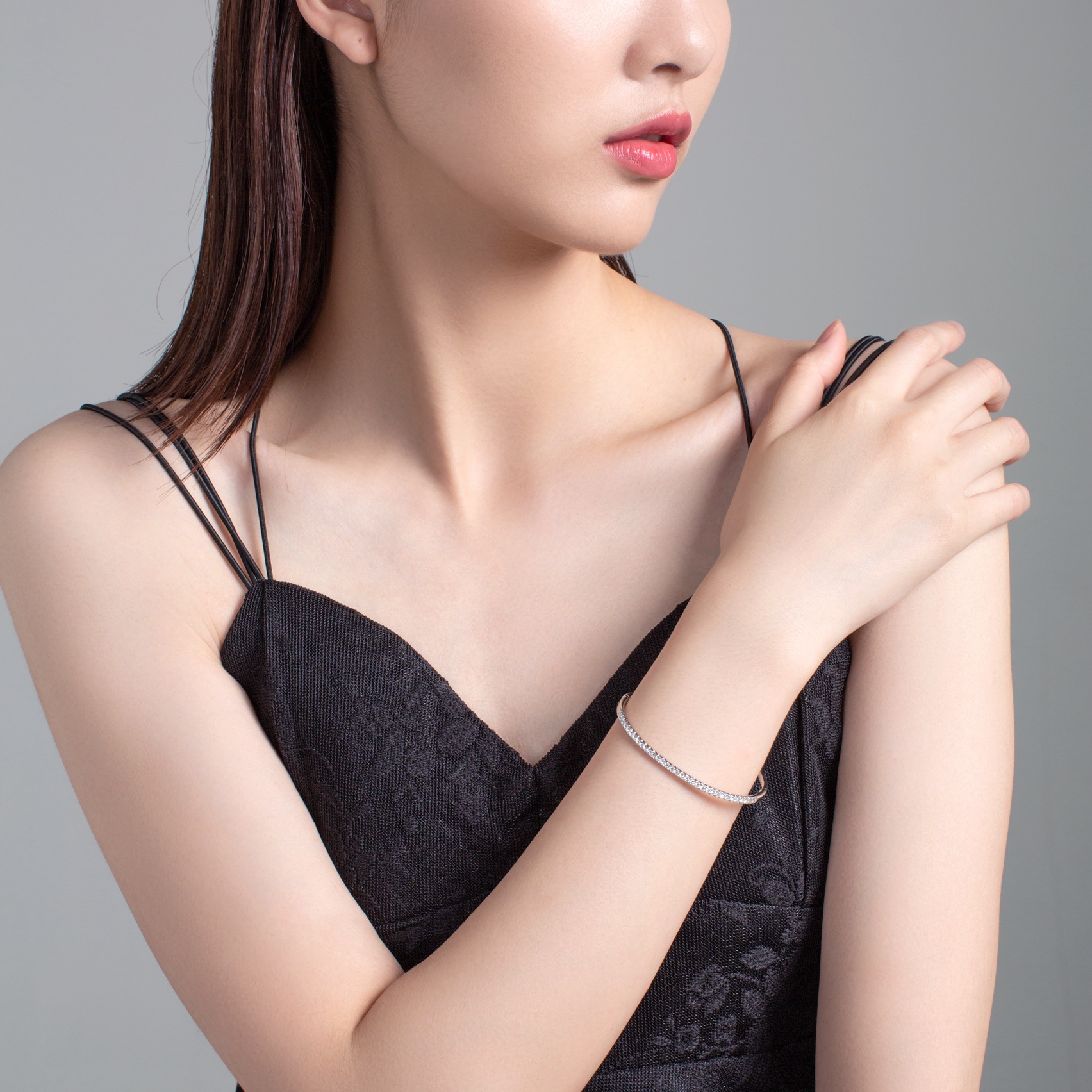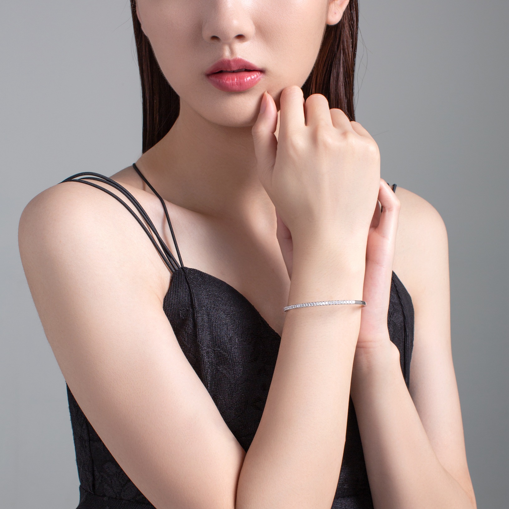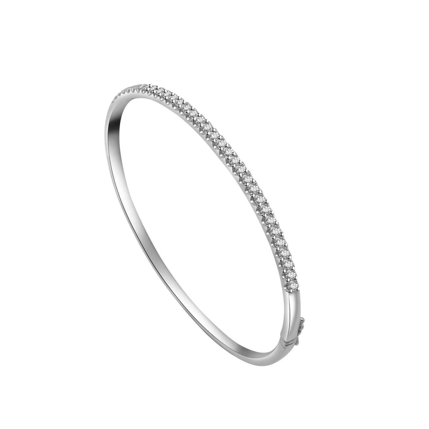 The women diamond fine jewelry bangles is made of rhodium plating on 18K gold and pave setting with round diamond in 36 pcs.