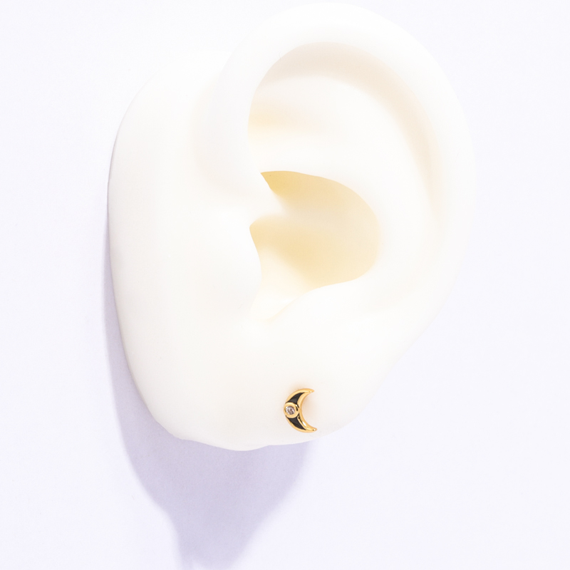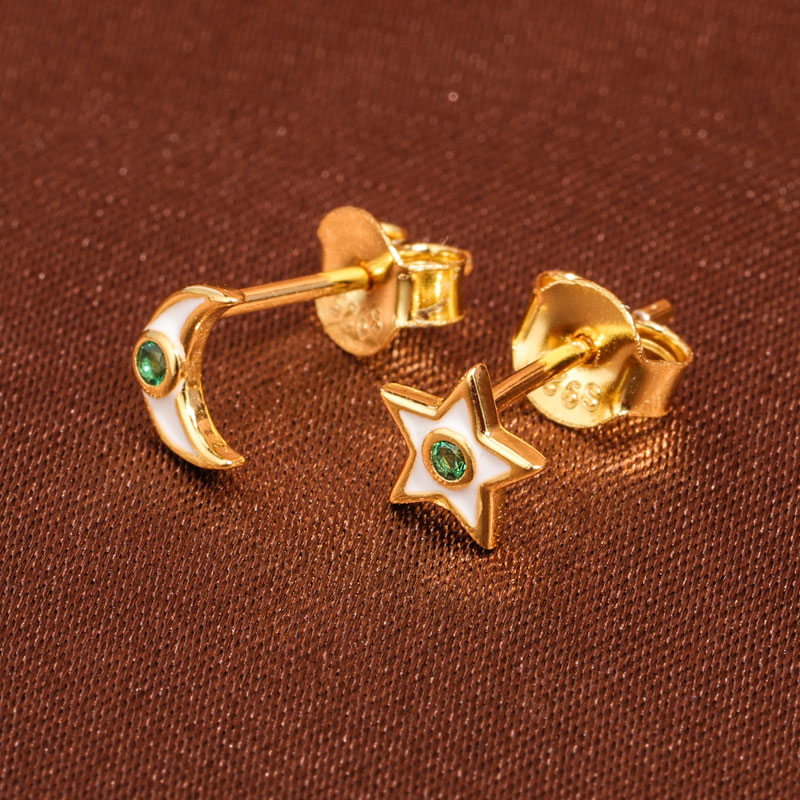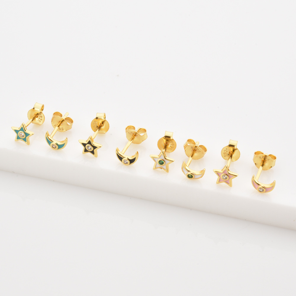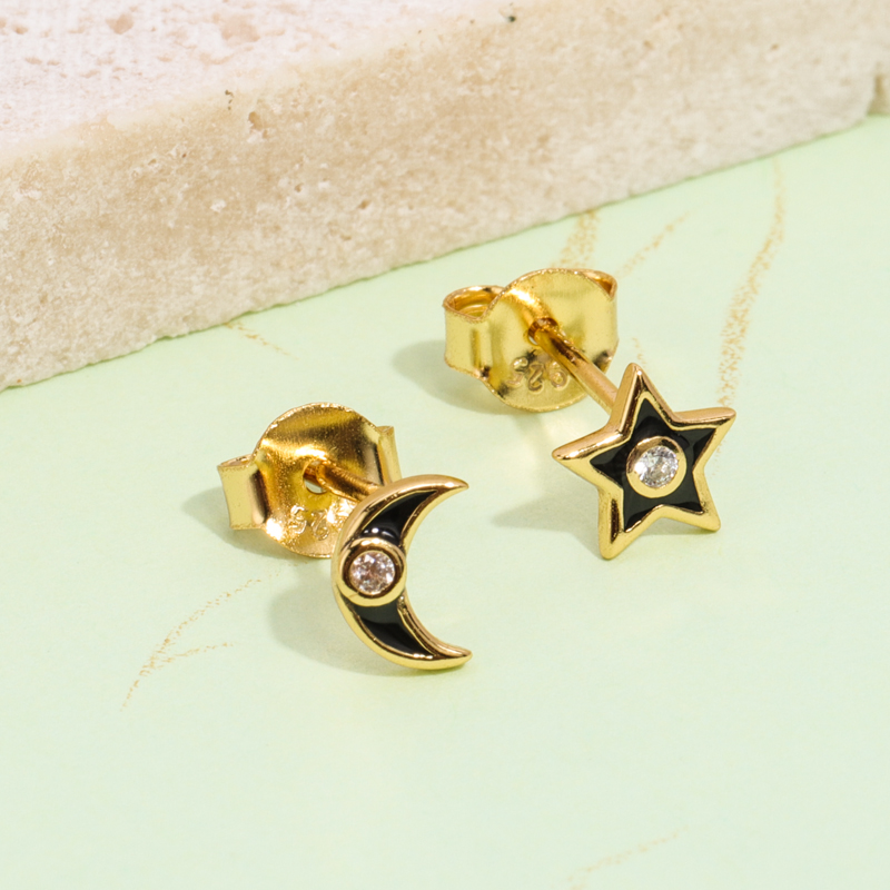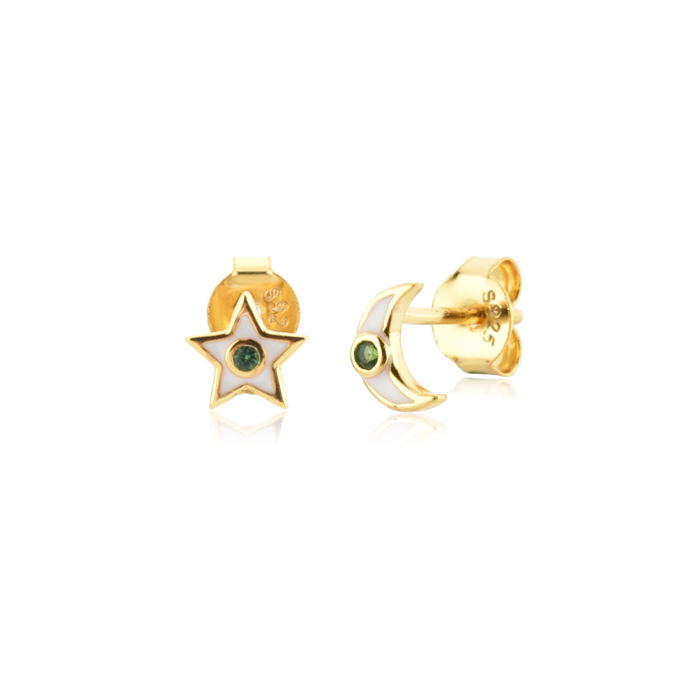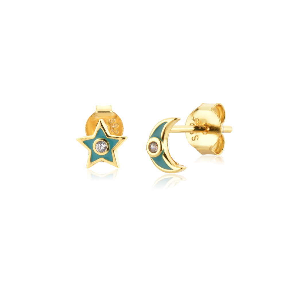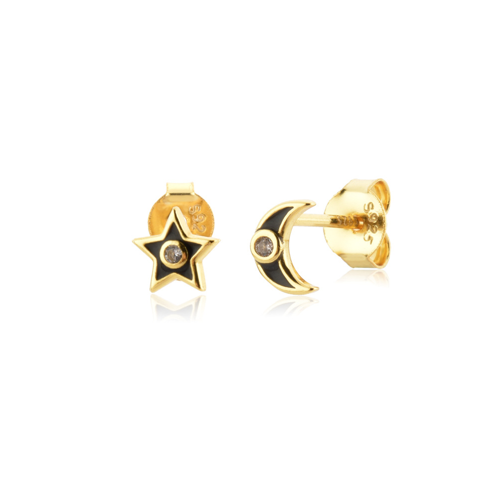 The moon star stud earrings are crafted in 925 sterling silver 18k yellow gold plated with fine jewelry craft.